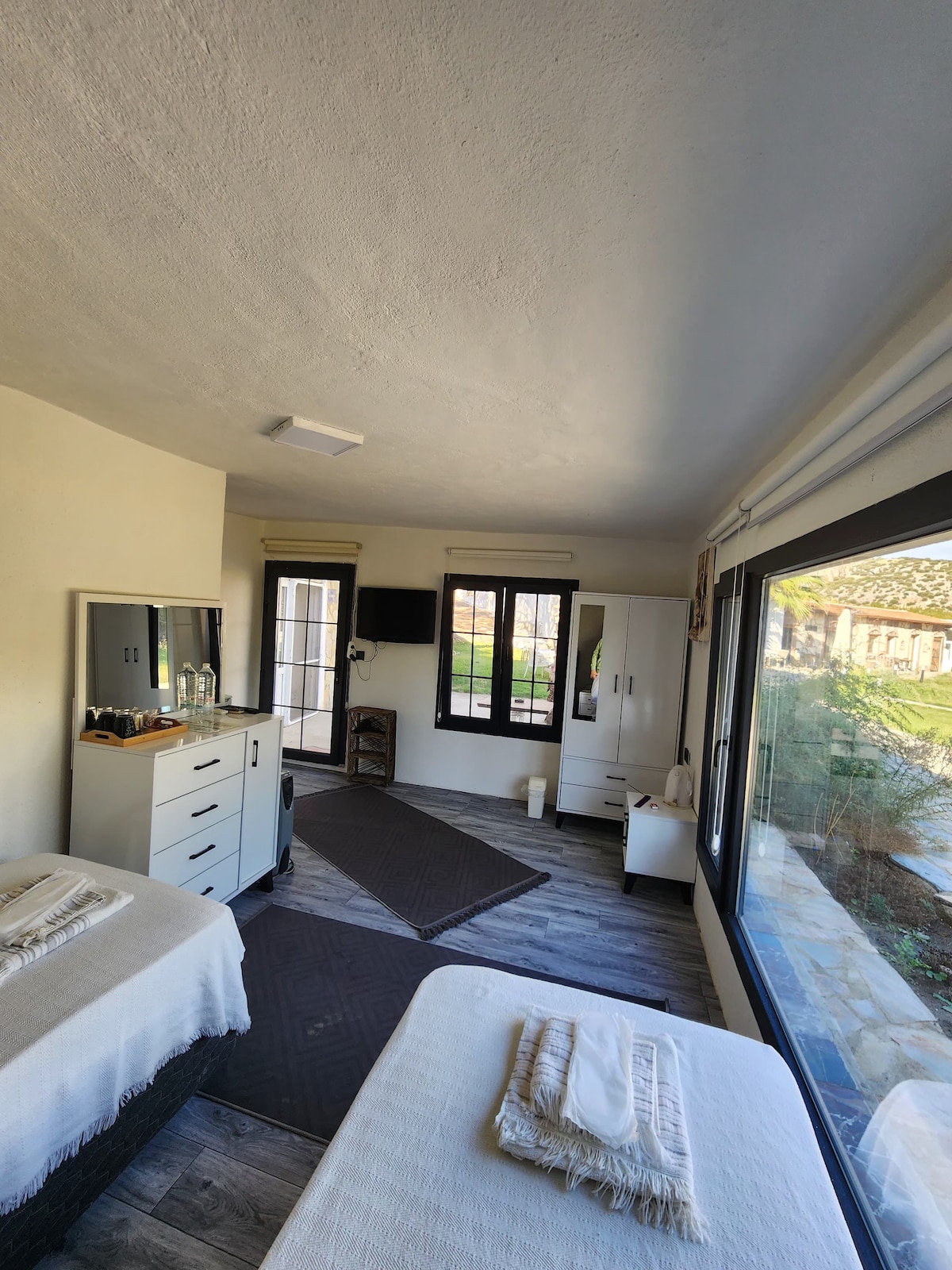 Evimiz bir cift kisilik yatakli olup 3.kisi icin koltuk bulunmaktadir . Konsept acik yatak odasi tiny house seklindedir. Dag manzarasi ve genis bir verandasi vardir.