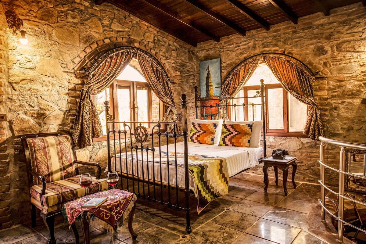 A 200 years old, two floor house. There is a stone wall living room downstairs. 2 double bedroom and one single bedroom is situated on the second floor along with bathroom and a hall way. The house is looking to the famous Şirince village from like a tophill and yet all the amenities of the village is in short walk distance. U r entering the house through a garden. U can as well enjoy the serenity of our garden and benefit our mostly home made beverages that we serve at our cafe