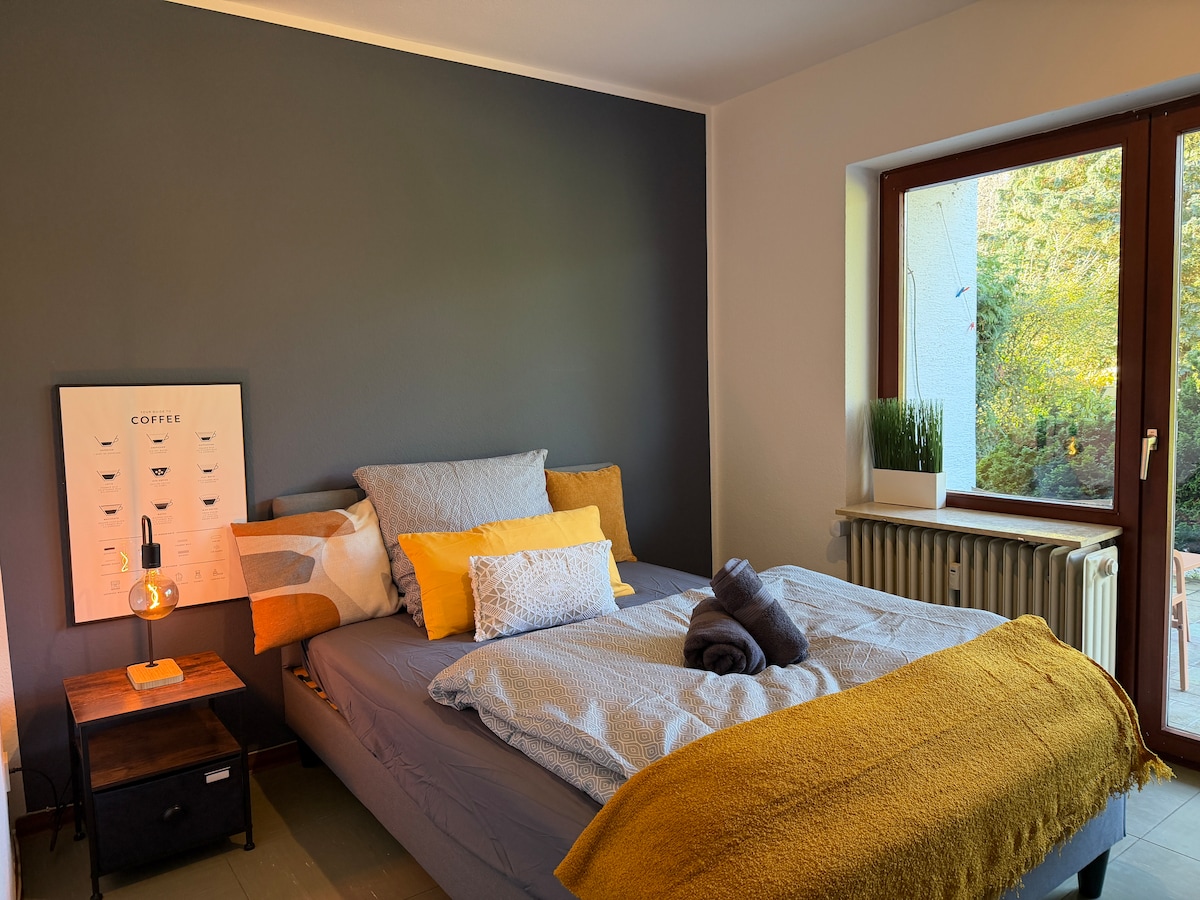 Only 5 km from Aschaffenburg on the foothills of the Spessart I offer a modern and sunny 2.5 room apartment with own entrance. It has morning sun on the roof terrace with a distant view and a balcony. 1.60 m bed, bathtub, TV, WiFi and kitchenette. Two friendly cats live here too. 15 minutes to the A3 and A45, but right in nature to relax. You can reach a 24-hour shop and restaurant within walking distance, and a 5-minute walk to the bus to Aschaffenburg HBF. I am looking forward to your visit !