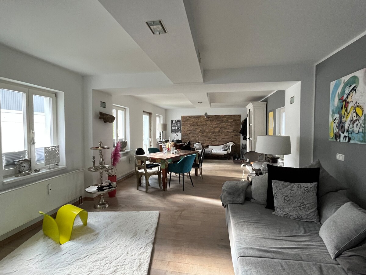 Das im Loftstil gebaute Appartment mit hochwertigen Möbeln und komplett ausgestatteter Küche sowie die beiden Badezimmer (eins davon en suite) sind mit Liebe zum Detail und Blick fürs Schöne eingerichtet. Entspannen Sie in der Infrarotkabine, die in einem der beiden jeweils mit 180x200 Boxspringbetten ausgestatteten Schlafzimmer steht oder in der freistehenden Badewanne. Alternativ kann man auf der großen Terrasse mit Blick auf den Hafen und Leuchtturm die Seele baumeln lassen.