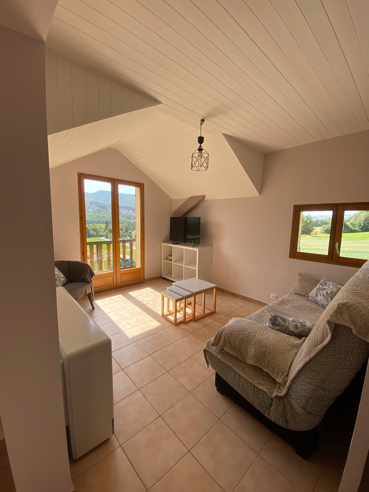 Dans un chalet un logement cosy tout neuf, accessible a pied par un petit sentier. Très calme, terrasse privative et jardin ,exposition sud/ouest vue panoramique exceptionnelle sur la vallée. Base de loisir et du centre du village 600m à pied,Parking public. 1 chambre parentale, un convertible pour 1 enfant dans la pièce principale, TV, Wi-Fi, salle de bain/WC. Cuisine : plaque cuisson, four,four micro-ondes frigo /congélateur, appareil raclette,mixeur, bouilloire machine à café.