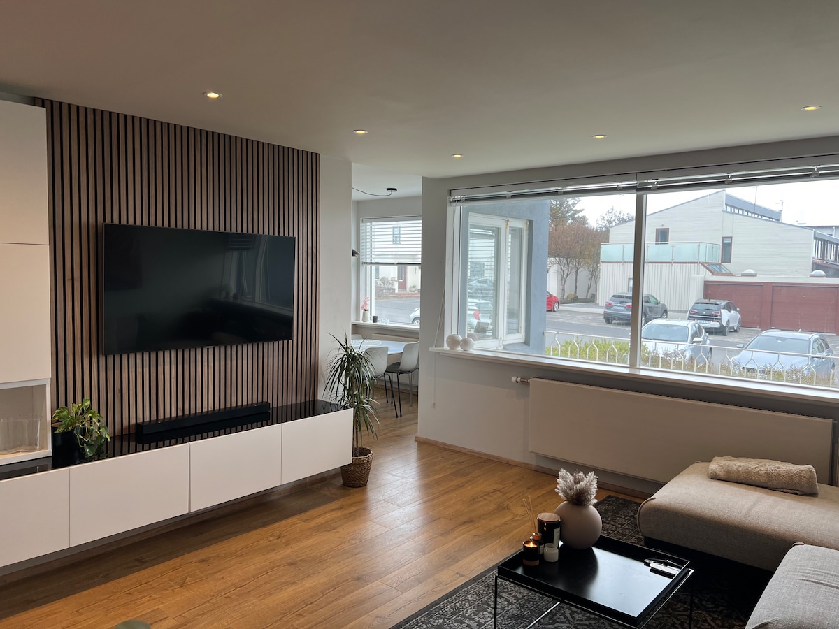 Bright and cozy 4th-floor apartment with stunning sea and mountain views. Ideal for couples, friends, or small families, it sleeps up to 4 guests (1 double bed + 1 sofa bed). A short walk to Grótta Lighthouse and 30–40 minutes’ walk (or 5-minute drive) to downtown Reykjavík. This peaceful, friendly neighborhood has a grocery store, gym, swimming pool, bakery, cafés, and more just 5 minutes away. Includes a full kitchen, private balcony, Wi-Fi, smart TV, washing machine, dryer, and free parking.