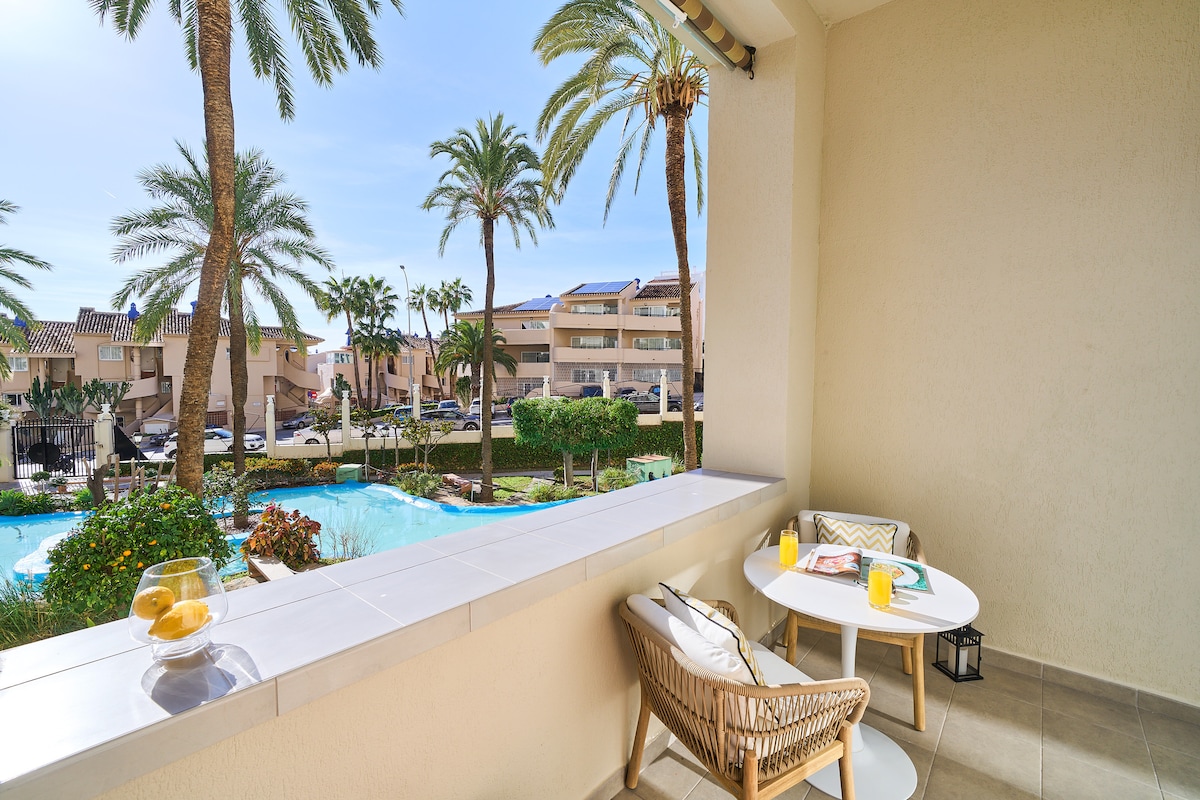 Welcome to this spectacular 1 bedroom apartment with 2 large terraces and a small inflatable Jacuzzi for the exclusive use of the apartment guests. The apartment has been completely renovated in June 2021. The apartment has AC, heating, and comes fully equipped so that the guest can have all the comforts (washing machine, dishwasher, home automation,...). The complex, on the beachfront, has 5 swimming pools and spectacular views of the sea and the mountains.