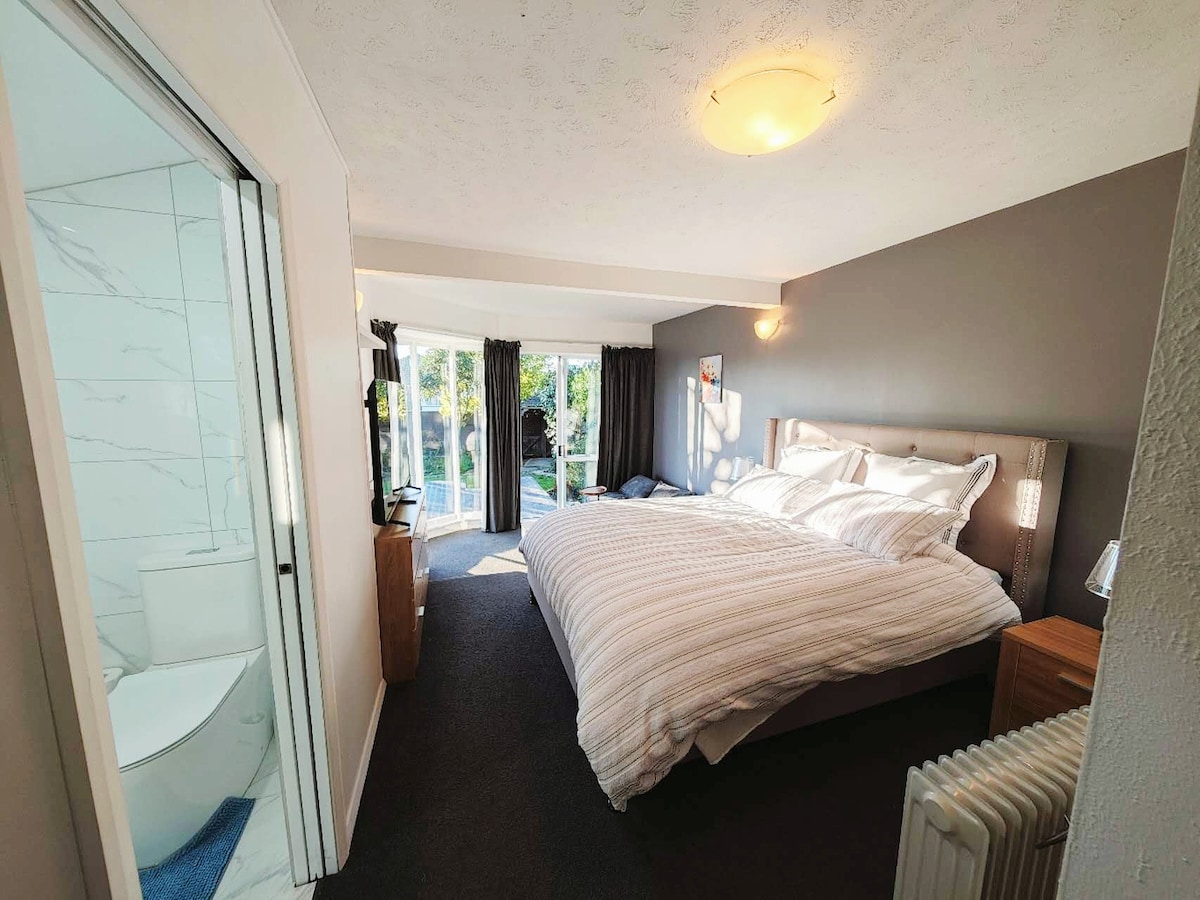 - Contactless check-in - Free continental breakfast - Unlimited fast Wifi - Smart TV with Netflix, Freeview, TVNZ+, ThreeNow and Prime Video. - Heatpump/aircon - Offstreet parking - 6 minutes to airport Warm, sunny and private with ensuite bathroom and french doors in a garden setting. Just 6 minutes from Christchurch airport and 10 minutes from the city centre. Relax and enjoy a generous continental breakfast, unlimited fibre optic Wifi and smart TV.