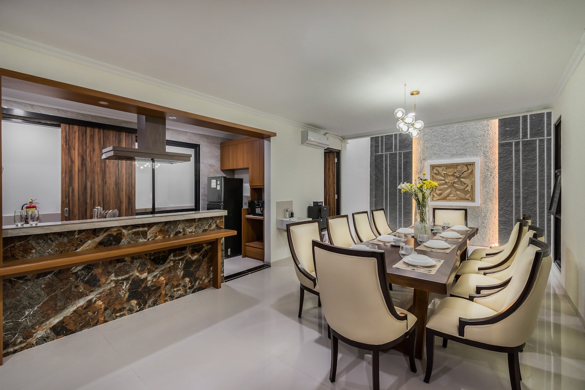 Step into this two-storey home with 4-bedroom in king and twin beds. A fully equipped service area includes kitchen, laundry, dining for a complete service experience. Unwind in a spacious and relaxing bath tube. Gated entrances, personalized digital key, CCTV, and 24/7 customer service. Stay connected with free WiFi. Walking distance to Tentrem Hotel and Mall Semarang. Only 3 minutes to Simpang Lima. 5 minutes to Lawang Sewu.