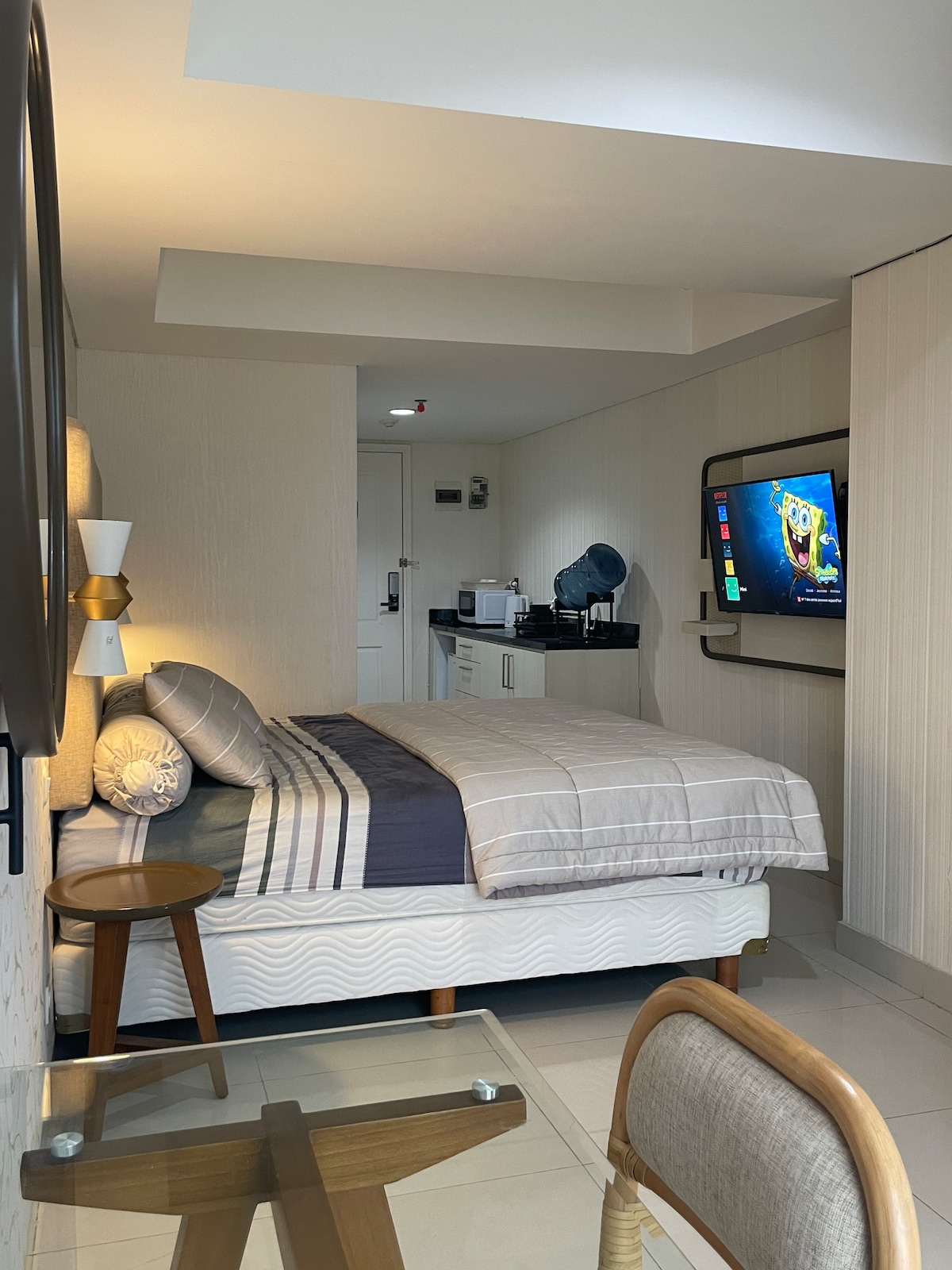 Located in Central Semarang Simpang Lima. This studio Apartment is nicely decorated with full amenities. Beautiful view of Simpang Lima from apartment. Very comfortable bed with large new 55" Smart TV, Pots, pans, dishes, microwave and coffee provided. Bathroom , Pool and restaurant on roof. Hundreds of restaurants and large Mall across from hotel.