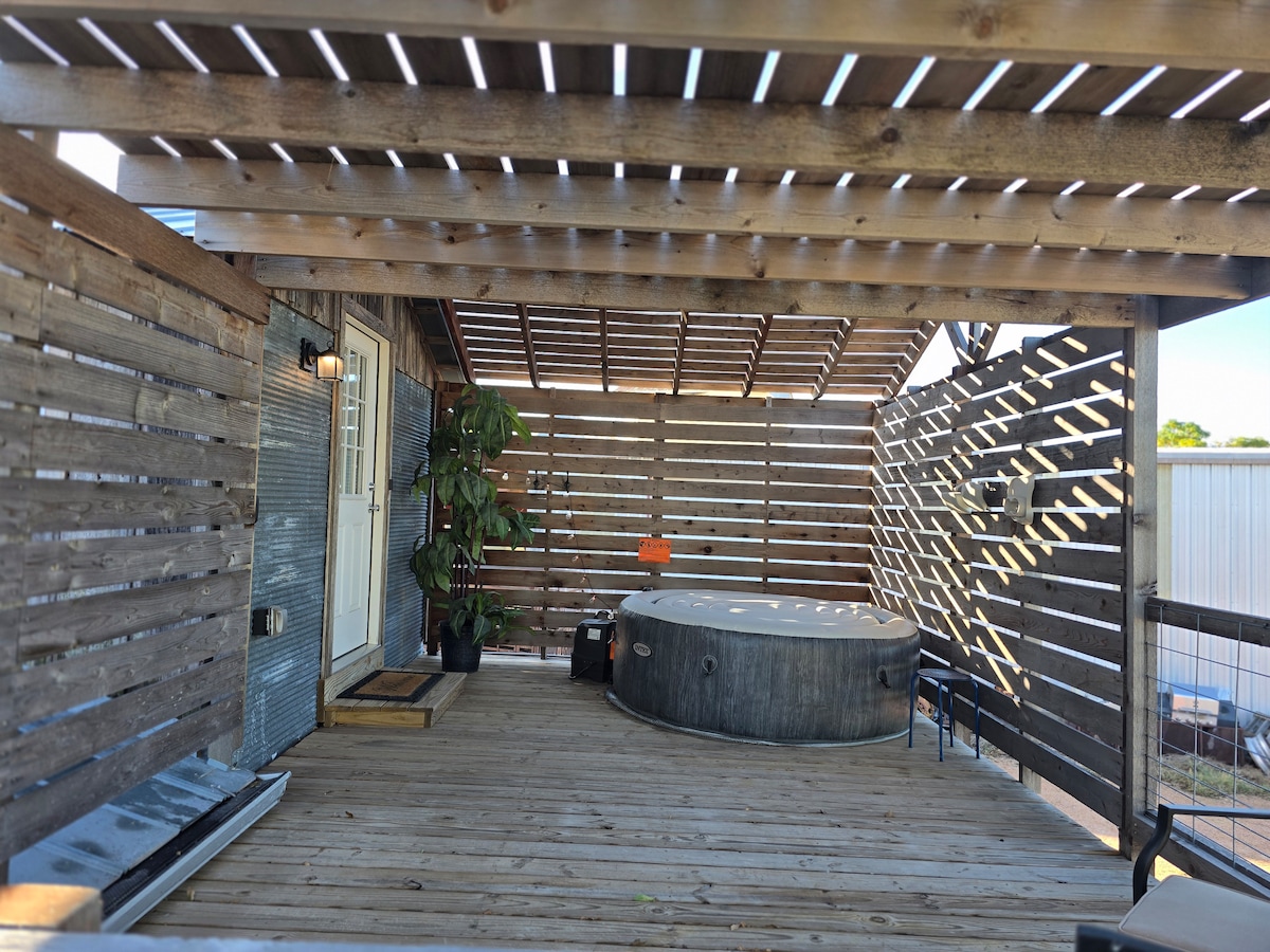 True Texas experience in the barn at a small ranch. See one of the biggest steers in the world at 13.5 long.. Stay in a luxurious loft in the barn constructed with whitewashed shiplap and rustic timbers. Big oversized windows and view the stables and pasture. The oversized cowboy bathtub is a converted water trough. This space features an open floor plan that includes 2 queen plus 1 twin size beds, a kitchenette and entertainment center. Vaulted ceilings make for a cozy stay.