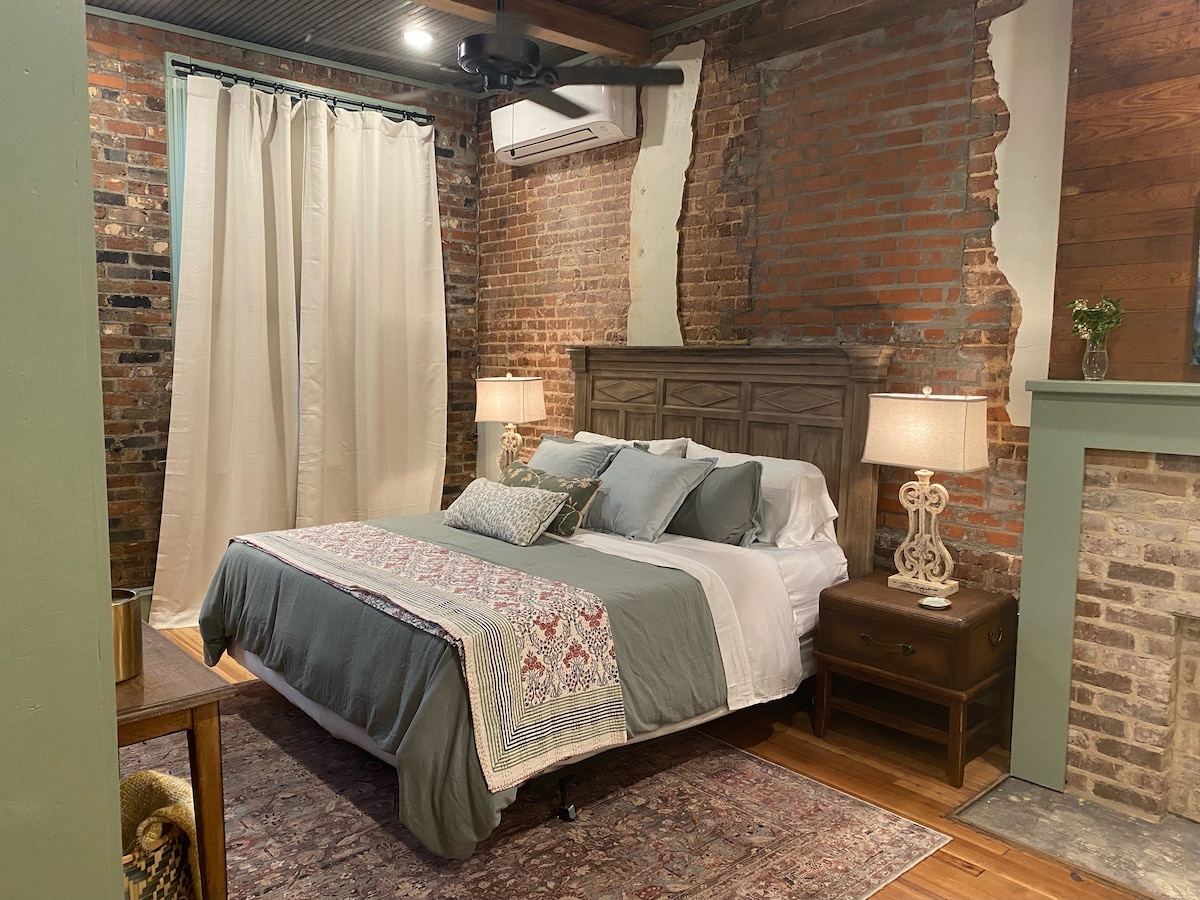 The Book & Table Inn is in a restored 1890's building in the gentrified downtown of Valdosta, Georgia on the corner of Patterson and historic Bennie's Alley, the most photographed spot in South Georgia. The September Room is our largest room at the Inn with both a window and door opening into the courtyard. The 12' ceiling makes the room seem even larger. There is a large closet with a fold-out table to provide a work space.