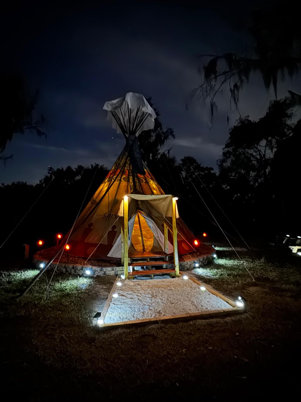 Spirit Warrior Tipi Beautiful 20' Tipi, in the woods of Music Springs - The most peaceful place in East Texas, where the touch of God runs through the woods. A place of refuge and a place to remember for many who visit. The trees are lit with over 1000 feet of party lights so that you can enjoy the pine trees after dark. We are located 5 miles north of Hawkins, Tx