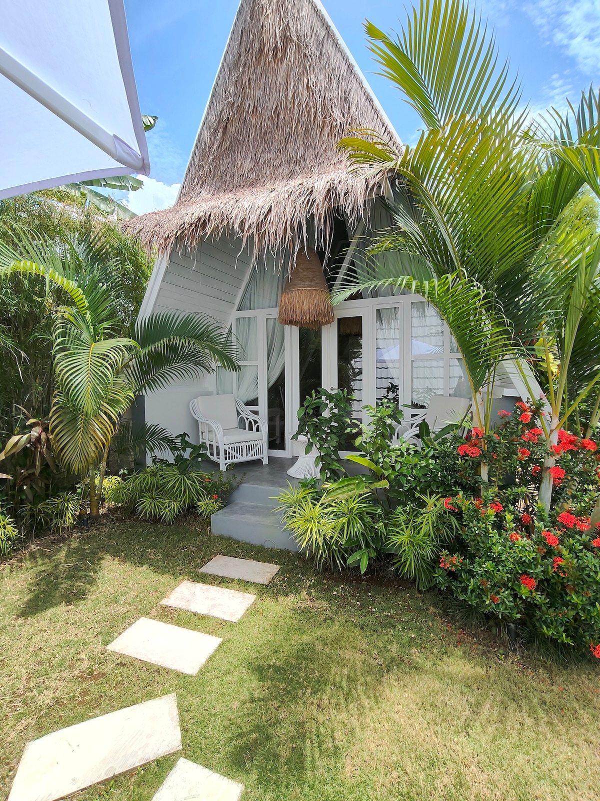Discover many surprising ways to unwind in this self-contained Villa Bungalow within our sprawling estate. Wander lush gardens, sway in a vintage-style tandem swing, or relax by the natural stone pool. Soak in a designer tub or choose a book that tickles your fancy and relax on the breezy patio/veranda daybed. Your King Bed is like sleeping on a cloud. Also included: - Separate kitchen - Daily maid/housekeeping service - Up to 150mbps Wifi - 8-10 min walk to the beach - Peaceful, quiet
