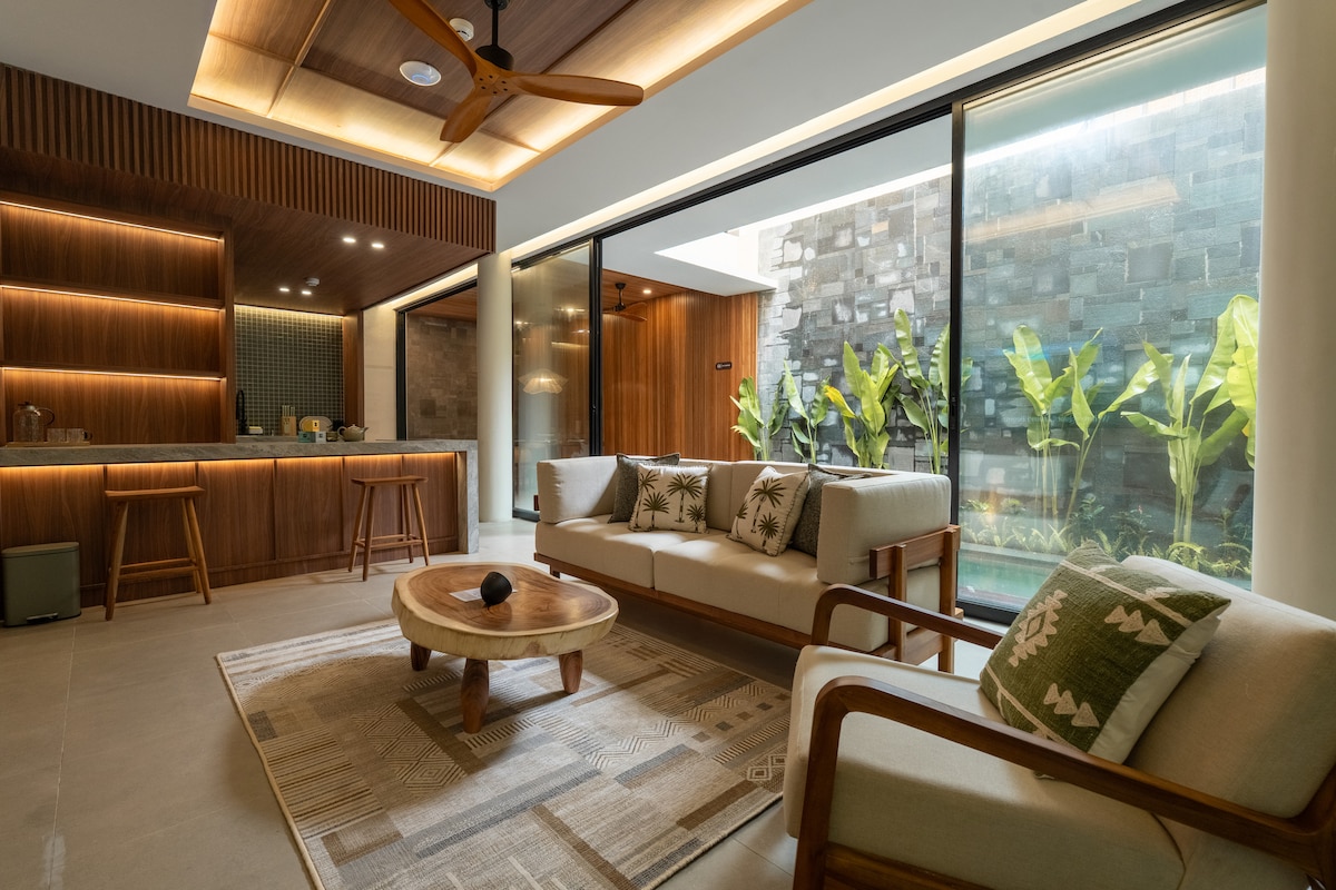 Warm wood. An open courtyard. A two-bedroom villa shaped around a central pool, where every space turns inward and distractions stay outside. Mornings feel unhurried, afternoons stay shaded, and evenings settle naturally as the light softens across the courtyard. Located in Kerobokan between Seminyak and Canggu, cafés and beaches are around 10–15 minutes away by scooter. And once you are back, everything stays quietly centered.