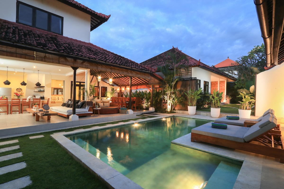 Beautiful villa built in 2017, mixing modern/traditional materials. Antique Joglo with huge enclosed living-dining & open kitchen fully equipped. 4 ensuite BR including 2 separate bungalows and enclosed living room with AC, cable TV. Nice pool (11.5 x 4.5m), all the rooms have their own privacy. Surrounded by a tropical garden, it's the right spot for relaxing, enjoying your holidays with friends/family. Located in a quiet alley, 10´walk to the beach, eat street, shops... Parking 2 cars
