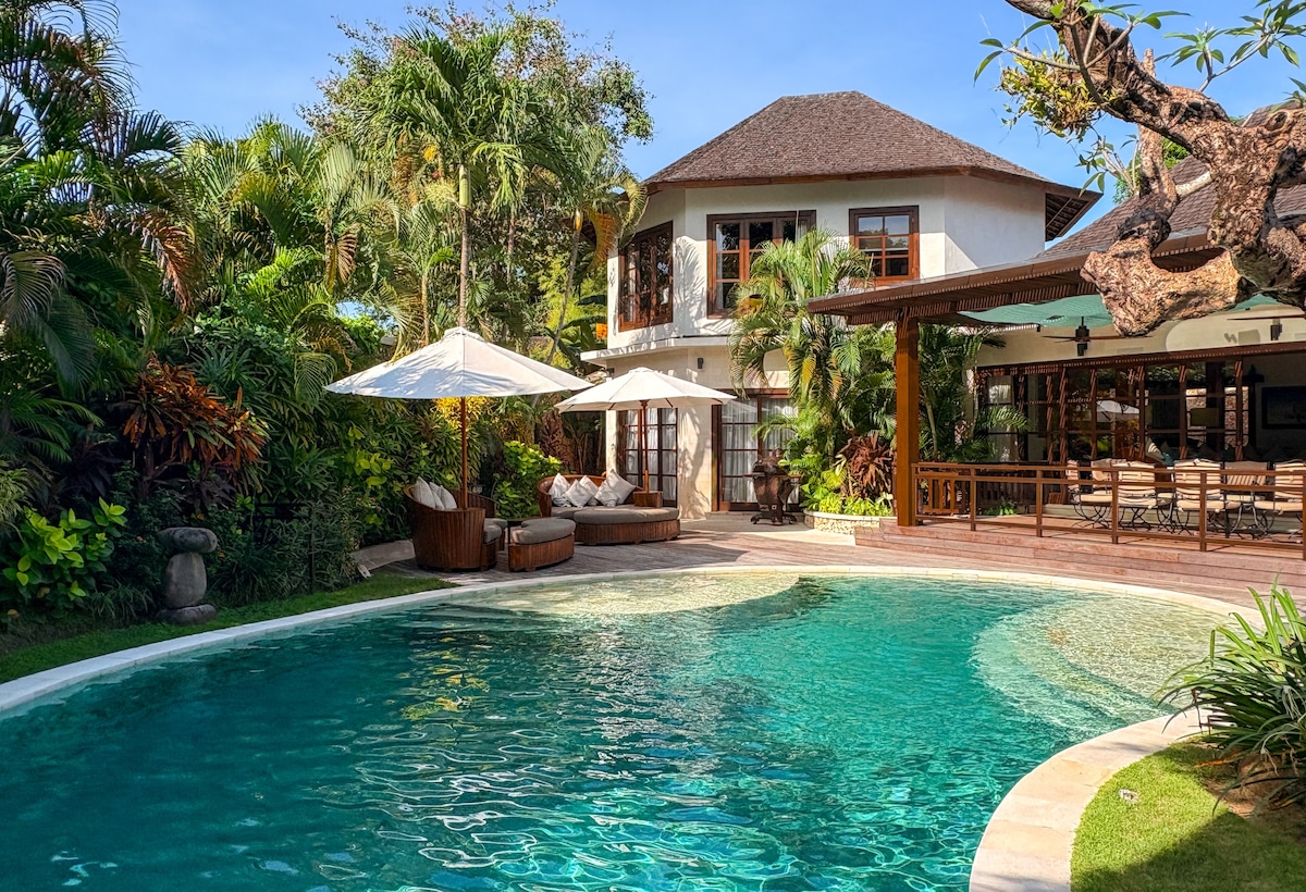 A serene tropical retreat in Seminyak, just 5 minutes from the beach. This luxurious villa offers flexible 3–5 bedroom options depending the total number of guests to suit any group size. Set within 1000m² of lush tropical gardens, it features a 16m private pool with waterfall, alfresco dining, a Harmony Pavilion with baby grand piano, and a cozy media room—perfect for group of families, friends, or group of a company, seeking elegance and relaxation.