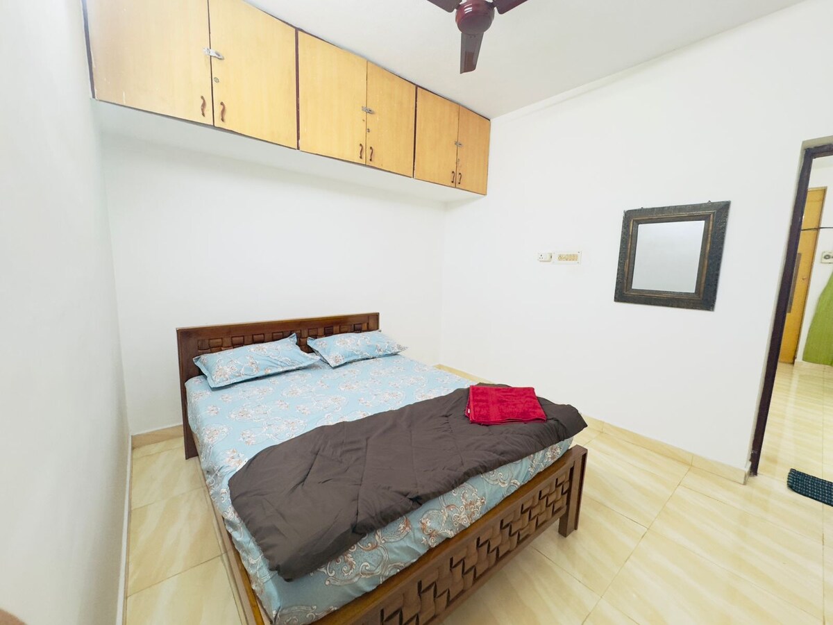 Situated on the third floor of an old residential building, the space features a furnished en-suite bedroom and balcony, and a dining room. No kitchen, but there is a refrigerator, microwave and kettle 25-30 minutes to the airport and railway station. 8 minute walk from Nandanam Metro Station. It is ideal for travellers seeking comfort and connectivity. It is accessible via elevator, and it has a shared entrance with a small office (please see the layout photo).