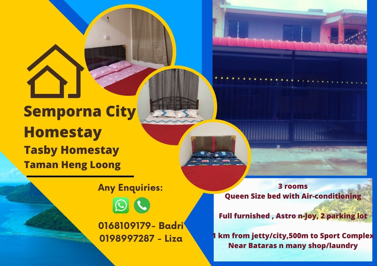 Semporna Homestay Located at Taman Heng Loong Just in front Bataras Superstore 3 rooms with Queen size bed and air-conditioning Full furnished 2 parking lot with rooftop Near all facilities Bataras,one stop centre, Gmart, Sport complex, Hospital, Police station, Jeti Bangau2 Many restaurants, not busy area, not jammed