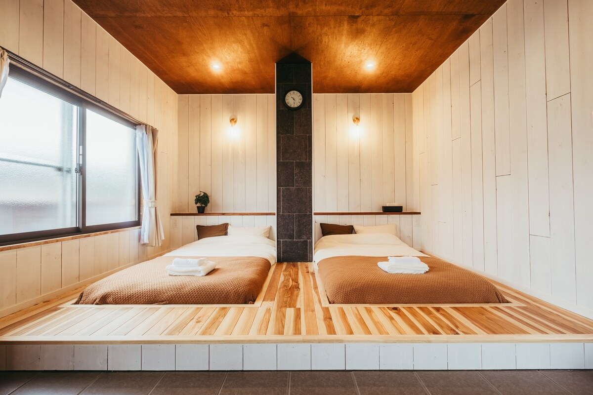 这座新建筑于 2022 年竣工。 走进这座外墙为黑色的别致建筑,通往客厅的石质走廊和高高的天花板会让你立刻忘记日常生活。 露天浴池四周绿树环绕,溪水潺潺,是冬季享受雪浴的绝佳场所。 浴池的出水口装饰着宫城县南部的特产--伊達冠石(Date Kanmuri Ishi),深受世界著名艺术家的喜爱。 在宽敞的木质甲板上,您可以坐在失重感座椅上享受森林浴。 清晨,您可以看到松鼠和鸟儿;夜晚,您甚至可以看到在灯光照耀下的森林中翱翔的帝王斑。 您可以在客厅和卧室使用 100 英寸大屏幕投影仪欣赏私人影院。 还提供显示器和办公桌,是工作度假的理想之选。 冬天是烧柴炉的季节。 尽情观赏火焰的变化,享受前所未有的特别时刻。 *预订和入住时,请阅读并遵守 "物业规则与限制"。