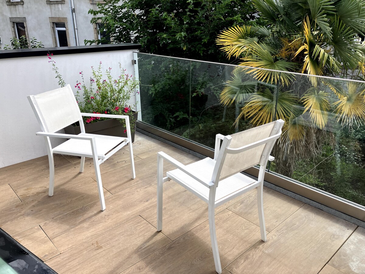 Pied à terre à Vannes avec grande terrasse sur toit, orientée plein sud, parking privé de 2 places, 65m² offrant une pièce de vie avec salon, canapé lit confortable pour 2 pers, une chambre avec belle qualité de literie. 2 salles d'eau, 2 WC indépendants. Ambiance raffinée alliant contemporain et classique. Le port, les remparts, les maisons à colombages, l'aquarium, la serre aux papillons, le casino, le bowling, la plage de Conleau, le départ vers les îles...