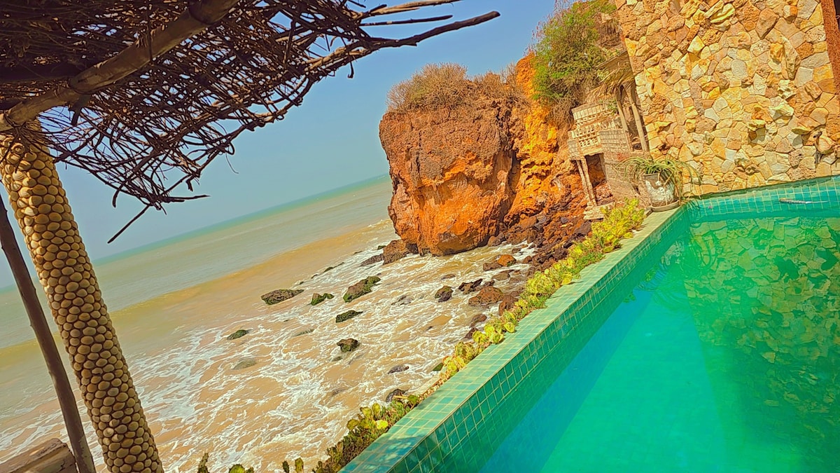 Palmarin, village authentique au cœur du Sine Saloum. La maison se situe à quelques centaines de mètres du village dans un jardin arboré de 3500 m2, au bord de l'océan et à la limite de la réserve naturelle communautaire. La chambre est située face à l océan , au bout du jardin. Chambre avec salle d'eau (douche eau chaude, lavabo, wc). lit 2 personnes avec moustiquaire, armoire, bureau. ventilateur. Possibilité d' un lit supplementaire d'1 personne . La piscine pour vous rafraîchir!