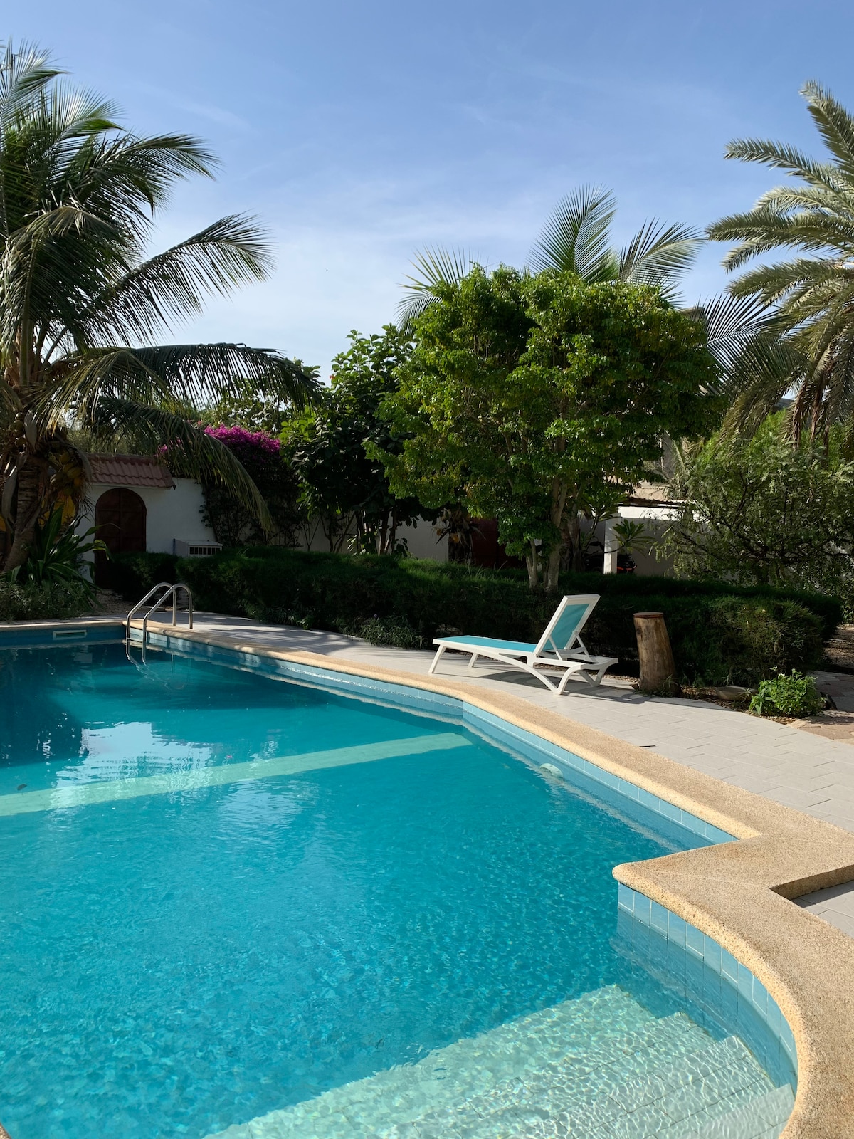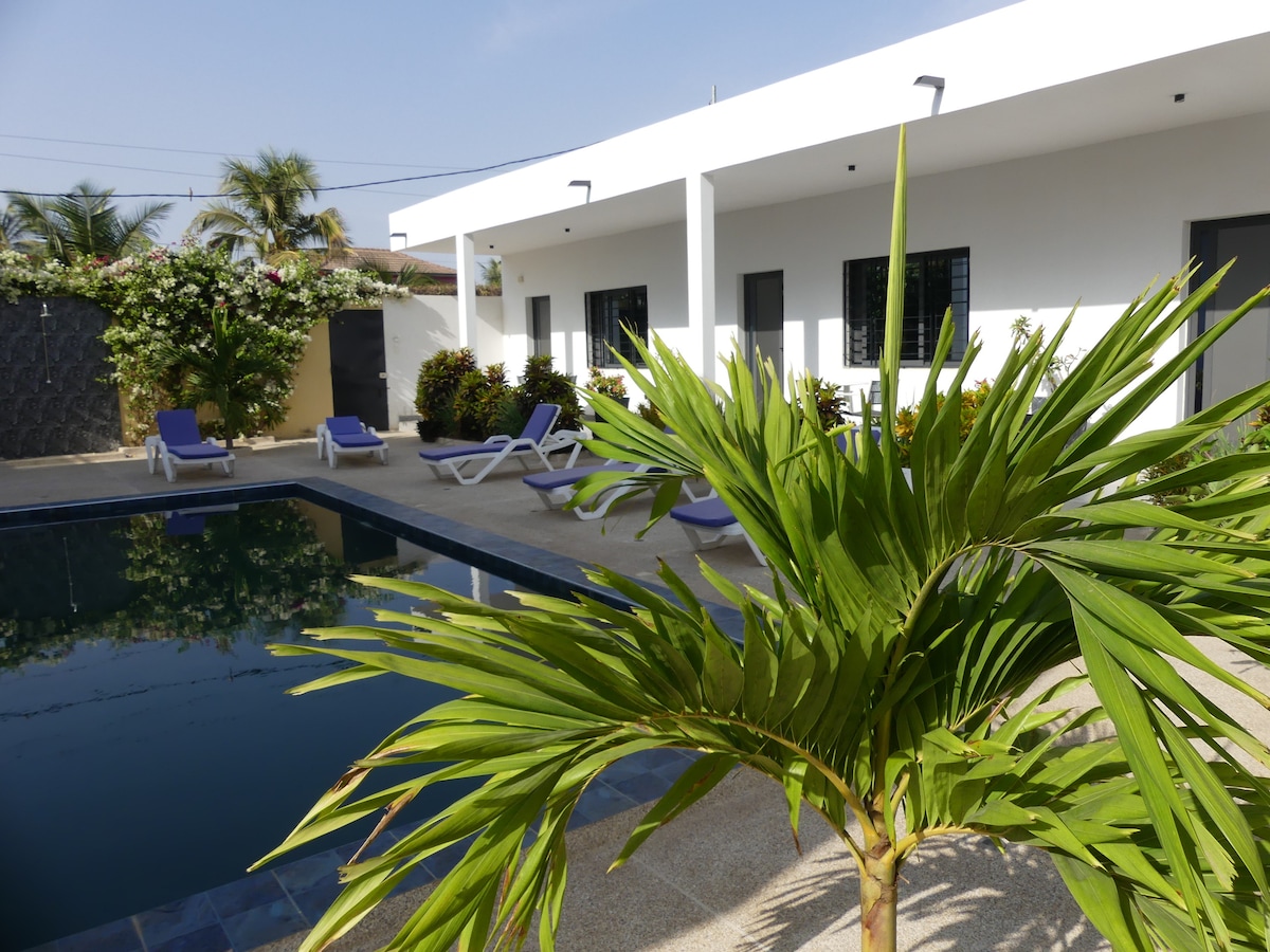 Lehne dich zurück und entspanne dich – in dieser ruhigen, stilvollen und modernen Unterkunft. Nagelneues Haus in ruhiger Wohngegend in Strandnähe mit kleiner Küche, Garten und Pool. Erlebe authentisches und gastfreundliches Senegal abseits der Touristenströme.