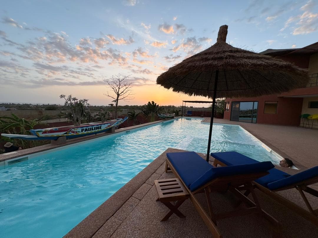 Profitez en famille de ce fabuleux logement qui offre de bons moments en perspective. Villa au toit de chaume , entourée d'un joli jardin à 1km du petit village de pécheurs de Nianing sur la petite côte à l'intérieur d'une résidence gardée 24h sur 24 avec sa piscine privée, située à 400 m de la plage . - Internet / WIFI a la charge du client -1 espace télévisions - Une piscine privé + une piscine collective - Plage à 400 mètres - Supérette d'appoint à l'entrée de la résidence.