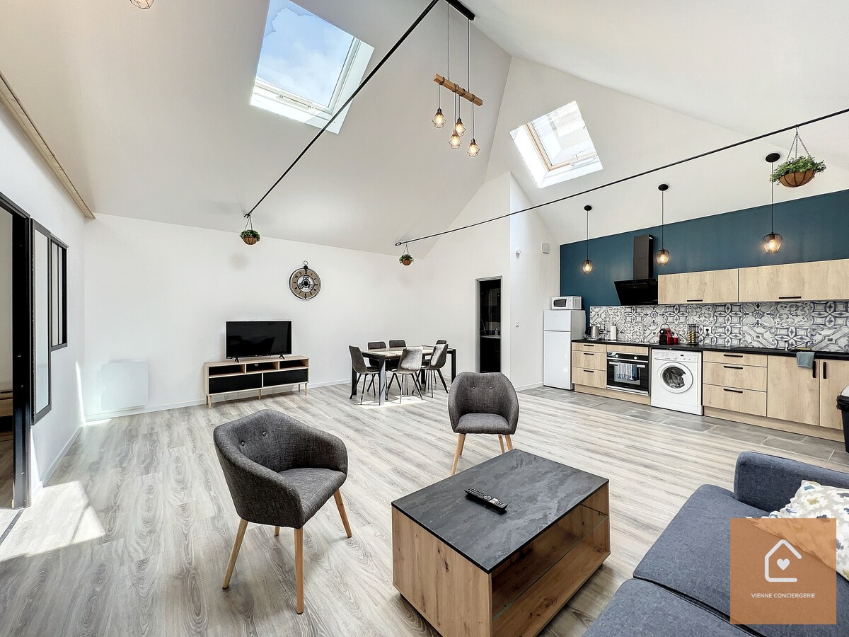 Dans une propriété de charme (ancien corps de ferme rénové) sur 3ha, nature et calme au rendez-vous. Location saisonnière de 60m2 composée : - Rdc : une cuisine/coin repas équipée (plaque électrique, réfrigérateur, lave-linge, mini-four, cafetière...). - Etage : une chambre (un lit 2 places + un lit 1 place + un coin détente salon, TV). Sdb (douche + baignoire), WC. Wifi. Jardin, terrasse, salon de jardin + barbecue.