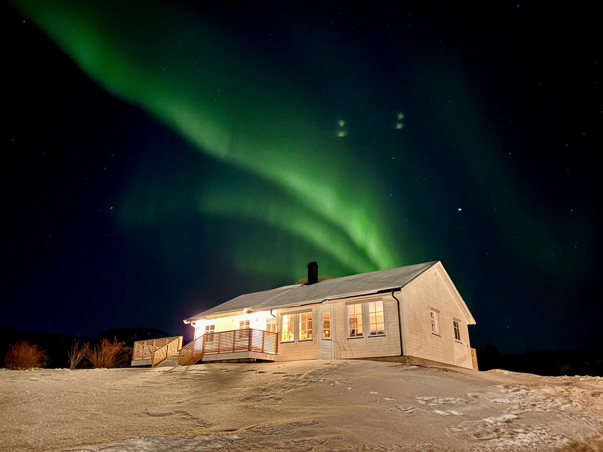 Et trivelig og romslig hus på yttersia av kvaløya med hav- fjell -Nordlys og utsikt. Personlig Serv/Hente og bringe/ billeie / guiding / Fisketur - Båtturer Huset inneholder stue, kjøkken, bad, 3 soverom og glasstue med mulighet for soveplasser. Etter en fin dag til fjells eller til havs kan dagen avsluttes i badstue eller grillhytte. Felles inngang med privat leilighet. tilleggstjenester, bookes separat: -Hente/bringe tjeneste t/r Tromsø flyplass -Billeie m/u sjofør -Båttur/Fisketur.