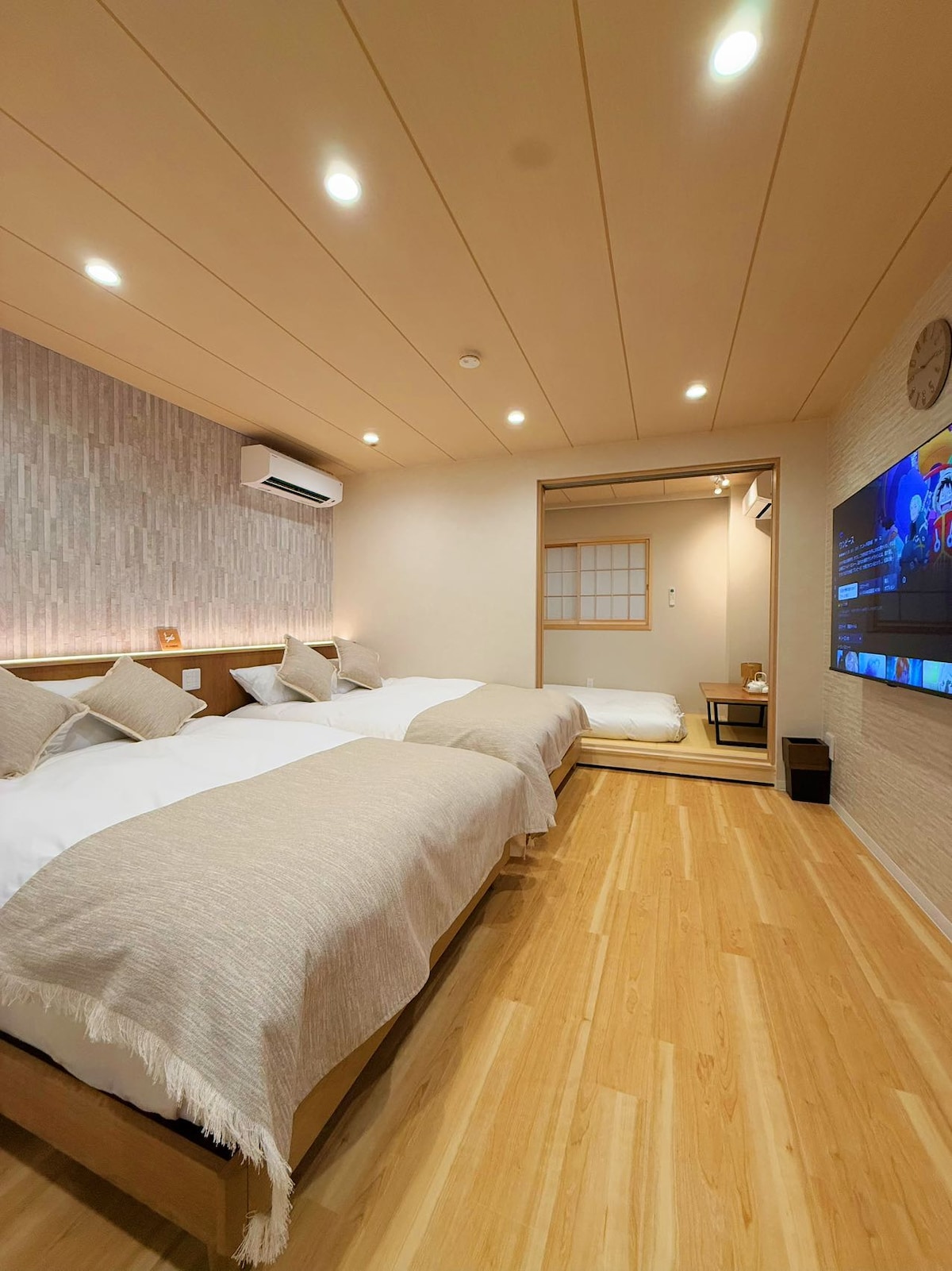 Enjoy a spacious Japanese-modern room with a cozy beds, tatami area, large dining table, kitchen. The room has 2 washbasins, 2 private showers, and 2 toilets, offering great comfort for groups. Located right in front of Tokyo Skytree, just 2 minutes to Solamachi and walking distance to Asakusa, it’s the ideal base for sightseeing. The area has supermarkets, convenience stores, and many restaurants. We have 9 identical rooms available. Experience your best Tokyo stay with us!