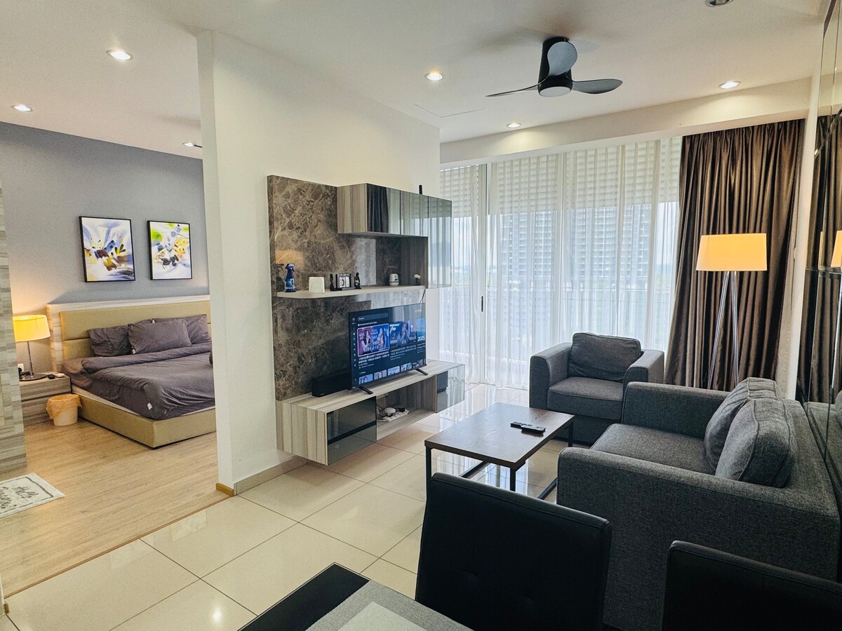 (1+1 BR & 1 bathroom) Contemporary modern and cozy condo in the heart of JB city centre. Suitable for 4pax family, friends and business group. **5mins to CIQ, City Square, KSL, Pelangi, and Larkin **8mins to Mid Valley Southkey, Larkin Sentral and Sentosa **15 mins drive to Paradigm mall, Sutera, Skudai and Mount Austin ✔ 4K SmartTV ✔ High Speed Wi-Fi, working tables with extension plug ✔ Washer ✔ Airconds in every rooms. ✔ Atari console, Mahjong, and Board games. ✔ FREE parking for 1 car