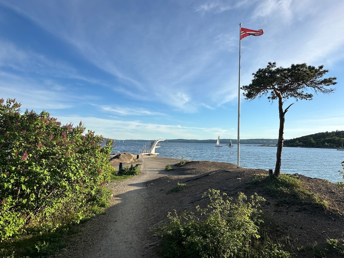 This is a beautiful apartment with an amazing view of the Oslo Fjord. You will be able to sunbathe in our lush garden and take a swim in the ocean from our boat dockage. The living room is quite large and has an open kitchen space. The private veranda is also perfect for enjoying the sun and the view. The apartment has two bedrooms and two bathrooms, one main bathroom and one WC with a washbasin.