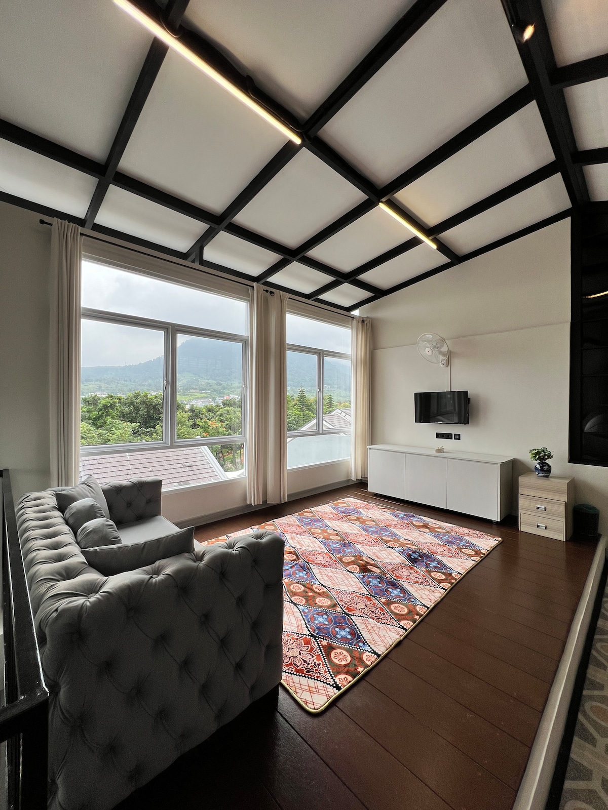 @di.alaya is located in the highlands of Sentul KM0, just an hour drive for you to escape the busy Jakarta. We have a mezzanine, 2 bedrooms with an open plan concept, 2 bathrooms, a kitchen, and an open terrace with a great view available from almost everywhere in the house. NO AC. Made for 4 people, can fit 6. Extra guests will be charged. Unsafe for children under 12 years old. PETS ARE ONLY ALLOWED FOR RESPONSIBLE OWNERS.