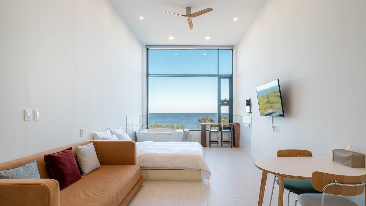 🌊 Cheongcho Lake View Residence – 3Room Royal Suite 🏖️ Exclusive suite with rare views of the East Sea and Cheongcho Lake Perfect for families. 🛏️ All bedding is replaced with fresh sheets after every stay, ensuring a clean, hygienic space 💙 🍳 Light cooking allowed. For strong-smelling food, use the 1F Cooking Studio (₩3,000 per person), equipped with tableware. 💦 Guests enjoy free use of the pool (Nov–Apr closed) and hot spring sauna (Airbnb only). Relax and enjoy the views 🌅