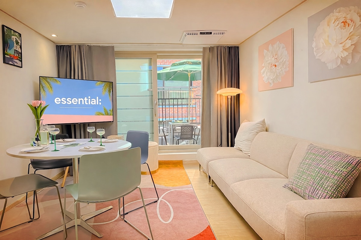 Welcome to our design house, created by a former architecture student from Samsung Engineering & Construction and a Qartar Airways flight attendant! This model-like house is furnished with stylish, new furniture, perfect for a fresh start. Marshall, Bose speakers and considering hosting a wine party for up to six people—it's an ideal setting for a newlywed couple! Super-sized projector where you can watch the latest films. Fantastic photo spot, filled with beautiful decor and charming props.