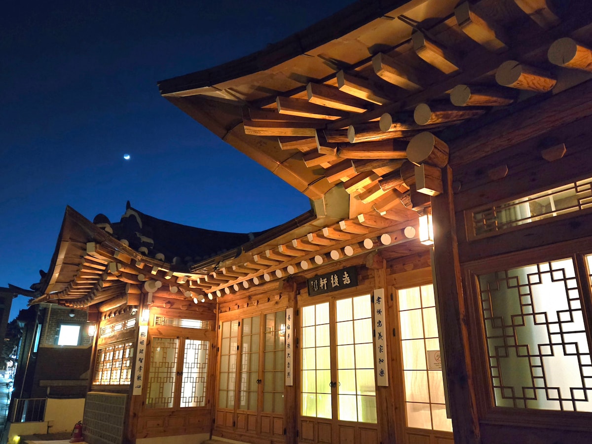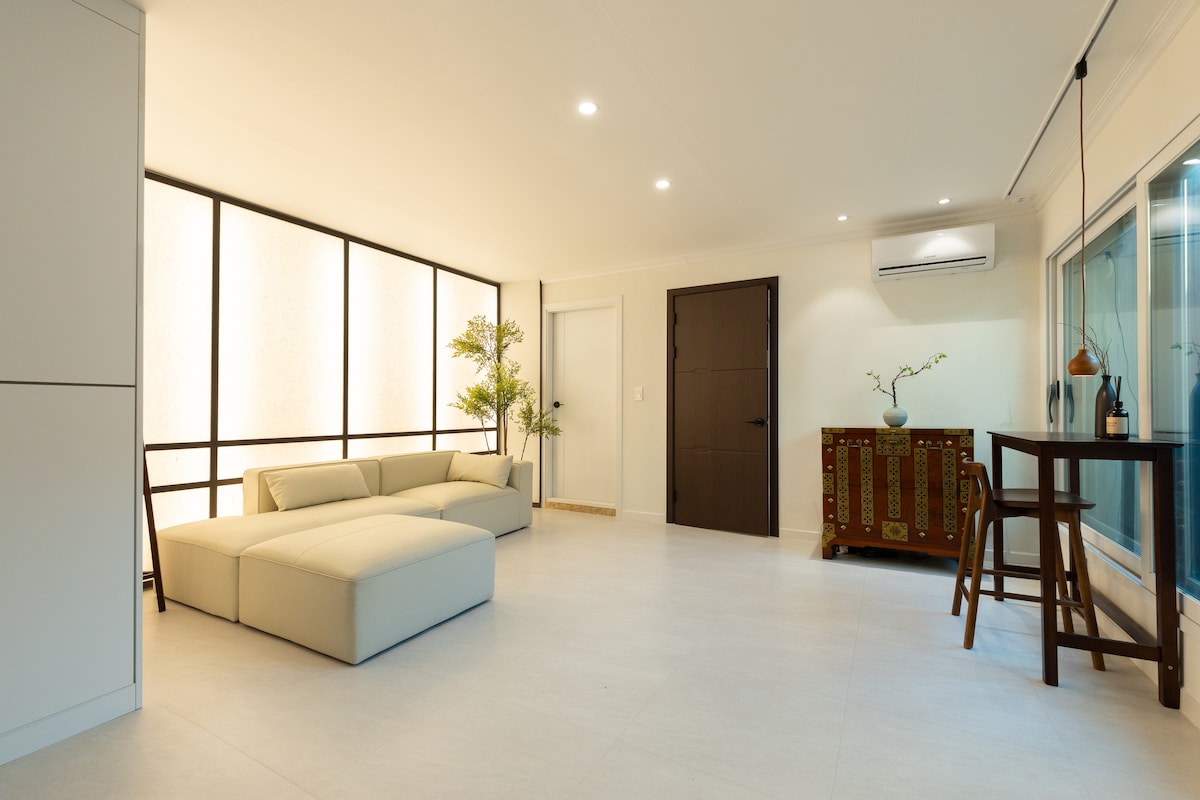 'Jieum' means a friend who deeply understands you. This space, like a longtime friend to the host, was rebuilt into a cozy Hanok stay. In a quiet alley of Seochon, 'Jieum;Dal' captures the simple and serene beauty of a traditional Hanok. At night, a beautiful moon rises over the wide courtyard, filling it with laughter and warm talks. * Close to City Center * Walk to buse stop and subway