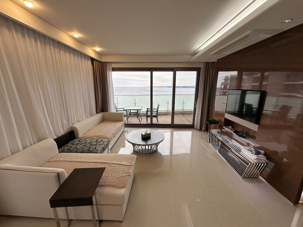 중문관광단지 내 오션뷰 패밀리스위트룸입니다. (Superior Family Suite in Seogwipo '중문관광단지'with excellent sea views and a 5-minute walk from the beach~) 방 3개인데 화장실 3개,침대 4개에 갖고 있는 패밀리 스위트룸이고 다른 숙소보다는 넓고 가족 여행 좋은 숙소입니다. 그리고 거실 창문을 통해서 바다를 볼 수 있고 뒤 베란다를 통해서 바로 연결되는 작은 정원이 있어서 산책하기가 좋습니다~ 객실 내 호텔처럼 수건과 샤워 용품들이 그리고 냄비와 일반 조미료를 준비되어 있어서 간단한 요리를 하실 수 있습니다. 다른 5성급 호텔보다 가족여행 좋고 가성비 높은 숙소입니다!