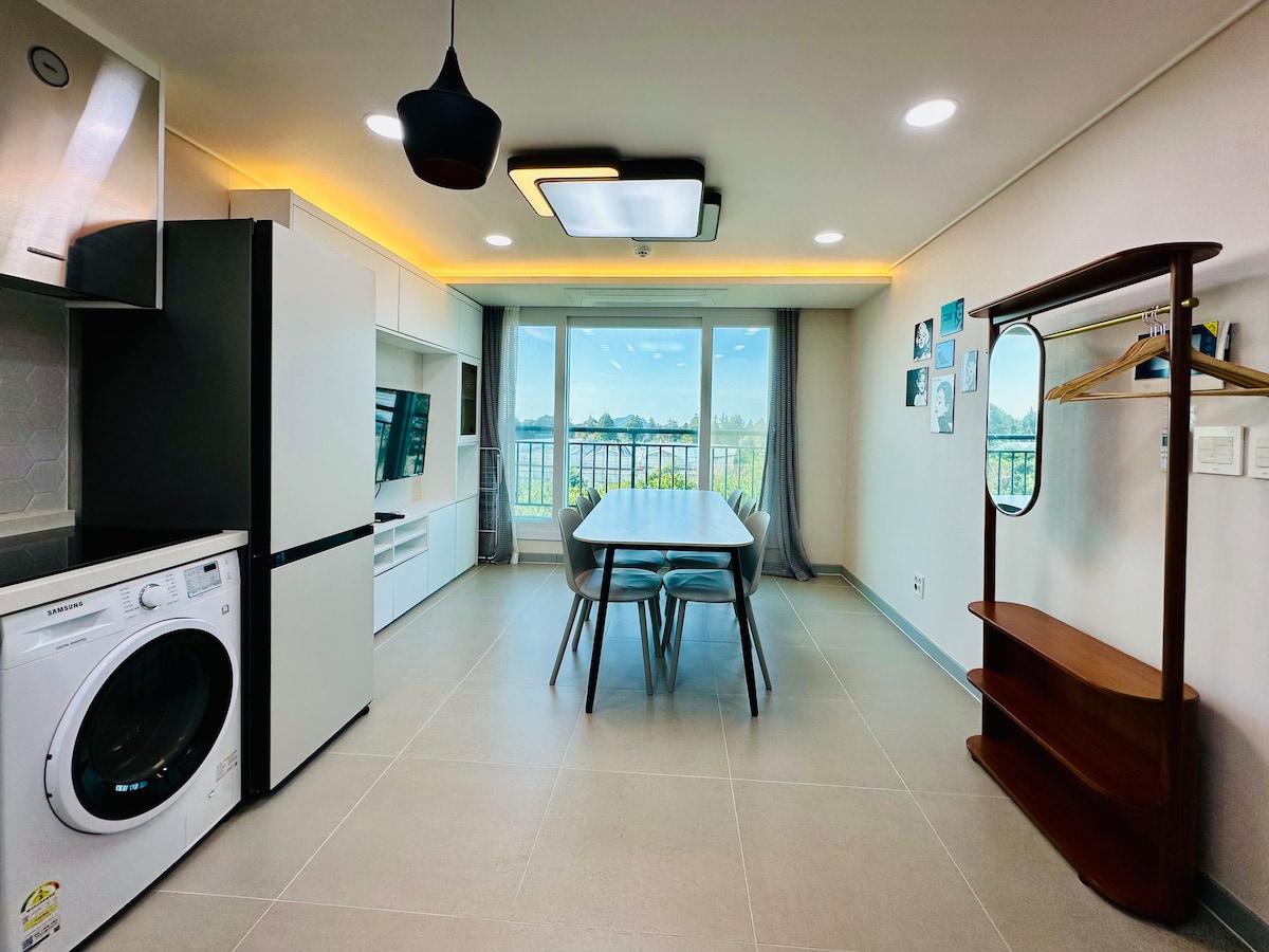 Collaboration of nature and modernity of Jeju. No hidden camera guaranteed. You can try the detector installed in the house. - up to 6 guests - duplex with one livingroom - 2 bedrooms: one with bed, one Korean Ondol - 1 bathroom - front yard - 35 min from the Airport - 3 min from Kimnyung Sea - 5 min from Maze Land - 10 min from HamDuk Sea - 10 min from WolJungRi Sea - 15 min to Pyeongdae-ri - 15 min to Bijarim Forest - 15 min to Sehwa Beach - 25 min to Seongsan Sunrise Peak