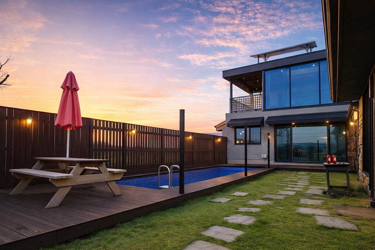 [布莱顿泳池别墅]济州岛西侧海景豪宅独立式泳池别墅,配备烧烤设施和泳池,可容纳 10 人