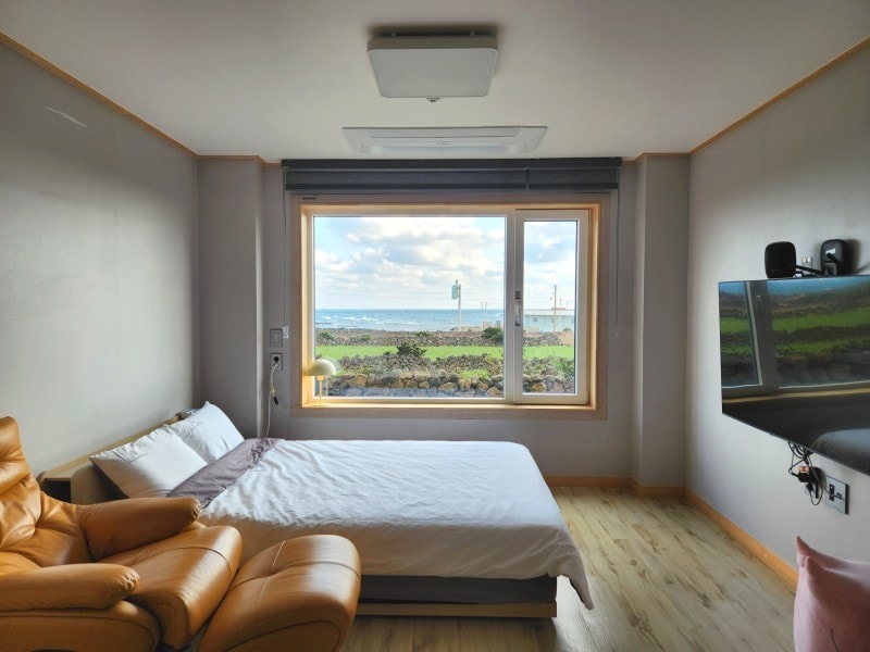 "SEOM Studio" where you can gaze at the beautiful Seogwipo Sea and Beomseom beyond the large window facing southwest. If the weather is good, you can stand on the rooftop of your room or the island building and enjoy the warm orange sunset. We have prepared this space with the hope that the time you spend here will be a moment to fully embrace the beauty of your everyday life. 111, Taepyeong-ro, Seogwipo-si, Jeju-do