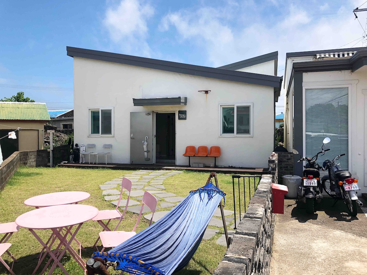 Hagwi Hale 3 is a peaceful and well-located stayโjust 15 mins from Jeju Airport and 3 mins from Aewol Coastal Road. Enjoy a private terrace with cafรฉ lights, a bright interior with a full kitchen, a queen bed, and a TV. Restaurants, cafรฉs, and convenience stores are within walking distance. You have street parking and easy access to Aejo Road, making it simple to explore the island. This is a cozy, convenient spaceโperfect for couples, friends, or small families.