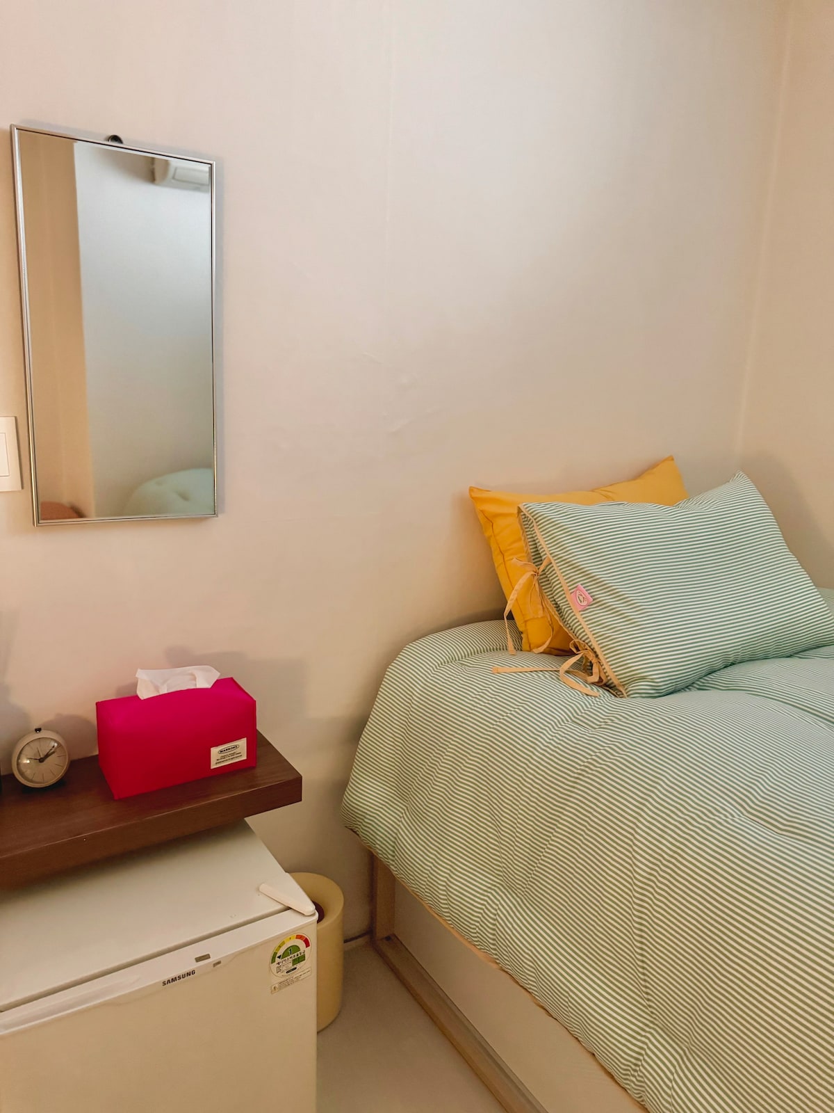 - 房间7坪,床135*200,书桌1300*600,可以保管行李 - 具备可办公、可做饭的简单餐具,智能电视 50 英寸 - Wifi, 大衣柜, 大冰箱, 洗衣机, 晾衣架, 吹风机, 毛巾, 纸巾, 水 收费停车 洗发水、沐浴露、护发素、香皂 - 从仁川机场到宿舍正门乘坐机场巴士时56分钟(包括6分钟步行) - 从宿舍可以走着去的地方 大创(6分钟),OLIVE YOUNG(3分钟),时代广场(3分钟),汗蒸房(6分钟) -从宿舍坐地铁去的地方 (附近有 1 号线永登浦站、2 号线文来站、5 号线永登浦市场站) 东大门 DDP(41 分钟),汝矣岛汉江公园(21 分钟),清溪川(41 分钟),景福宫(39 分钟) 弘益大学入口站(24分钟),北村韩屋村(41分钟),明洞(36分钟),圣水洞(47分钟) 文来洞(12分钟),永登浦站是KTX停车站,去釜山等地方很方便。 清晨感受着从窗户照进来的温暖阳光 晚上坐在房间的窗边享受时代广场的夜景