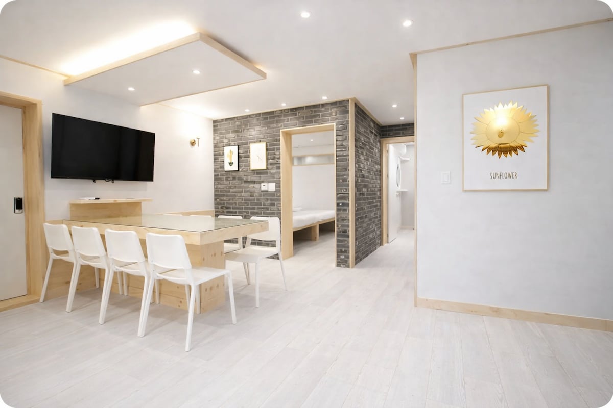 ★ Winner – BEST OF THE BEST SUPERHOST – Airbnb Korea A thoughtfully designed home for family and friends in the heart of Hongdae. • Private terrace • 4 bedrooms, 3 bathrooms (approx. 170㎡) + optional attic sleeping space • Prime central Hongdae location • 3–5 min walk to Hongdae Station (3 subway lines) • 1,000+ restaurants, cafés & shops within walking distance • Luggage storage / Airport pickup available / Elevator access