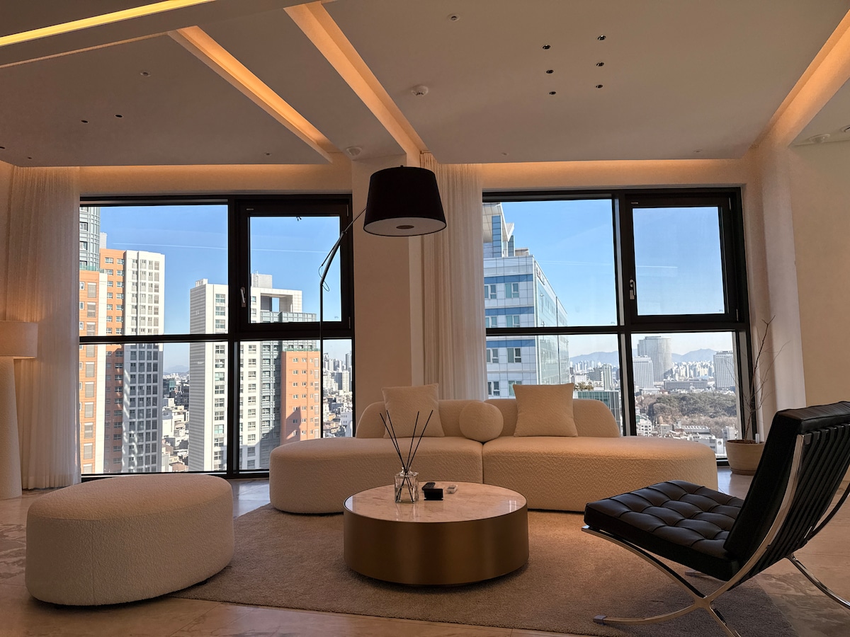Fully renovated and cozy penthouse apartment with great views of Seoul. Don't miss the one from the hinoki bath. Portable WiFi provided. Great location in trendy Gangnam, one of the busiest districts of Seoul, blending modernity and tradition... Right out of Subway line n. 9 Bongeunsa station with Bongeunsa temple, Coex Mall and SM Town literally at your doorstep. 강남 도심과 한강, 그리고 녹음과 전통의 미가 어우러진 봉은사까지 파노라마 뷰를 즐길 수 있는 펜트하우스입니다. 고급 자재를 사용해 풀리노베이션하여 모던하고 쾌적합니다. 히노끼욕조에서 도심 노천탕 분위기 속에 피로를 풀어보세요.