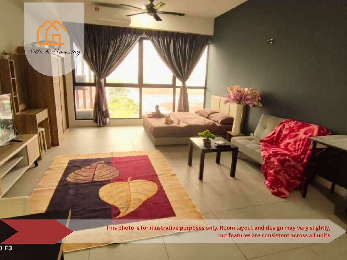 Explore our cozy studio, which can accommodate 2 to 3 people with a queen bed and a sofa bed. Only a 15-minute drive from KLIA T1/T2, the place is surrounded by many restaurants, fast food branches, groceries, and laundry shops, all within walking distance. Savor all the amenities, including the kids’ playground, BBQ area, gym, and swimming pool, with 24/7 security. * Unavailable drop your luggage before check in hours.Due to building designed, need to walk 10 steps staircase to get elevator.