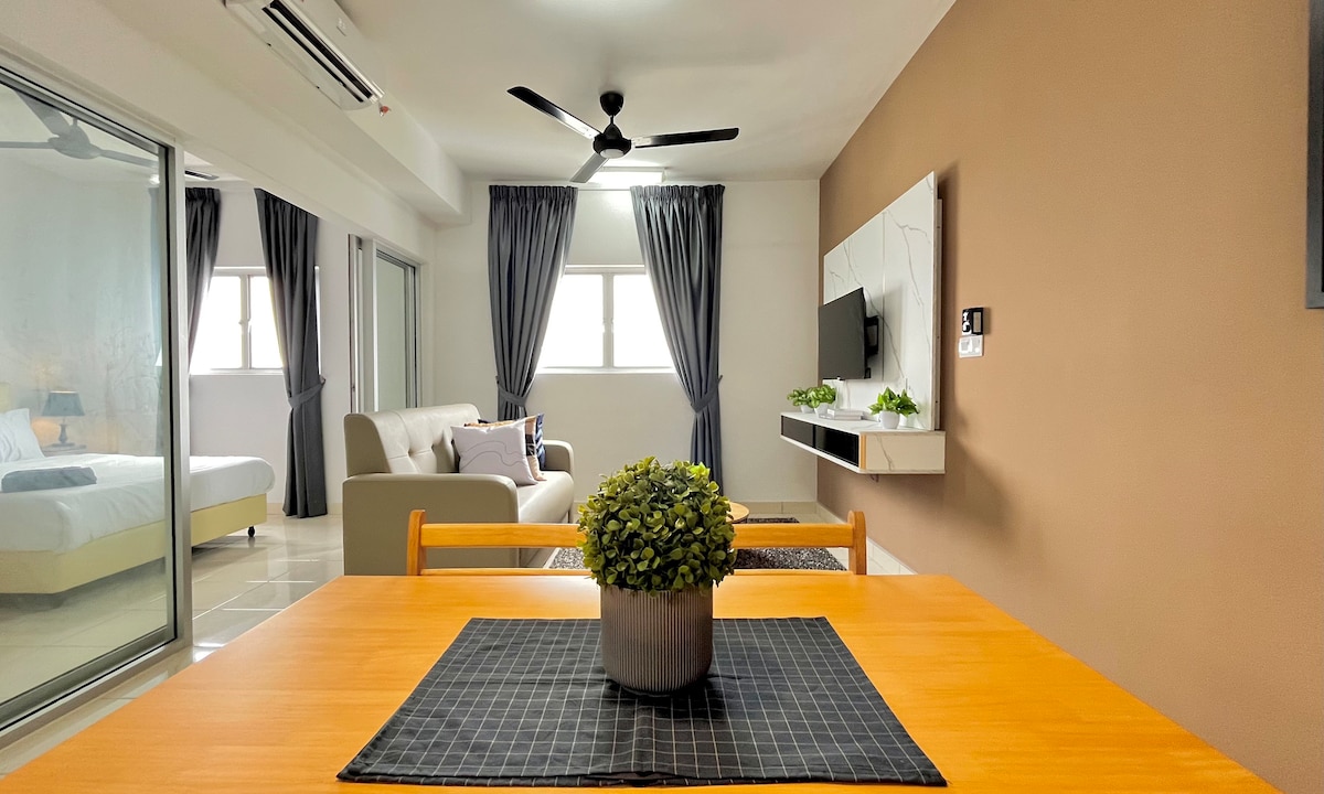 FREE COMPLIMENTARY PARKING An exclusive and chic homestay designed and built personally from the ground up will truly excite the senses for those who are travelling to Cyberjaya. The unit comes exclusively with 100mbps 5G wifi and a dedicated Netflix account to cater for those who come to work and relax. Tamarind Suites also offers visitors plenty of things to do from it's fully-equipped gyms, infinity pools, shops, restaurants and cafes.
