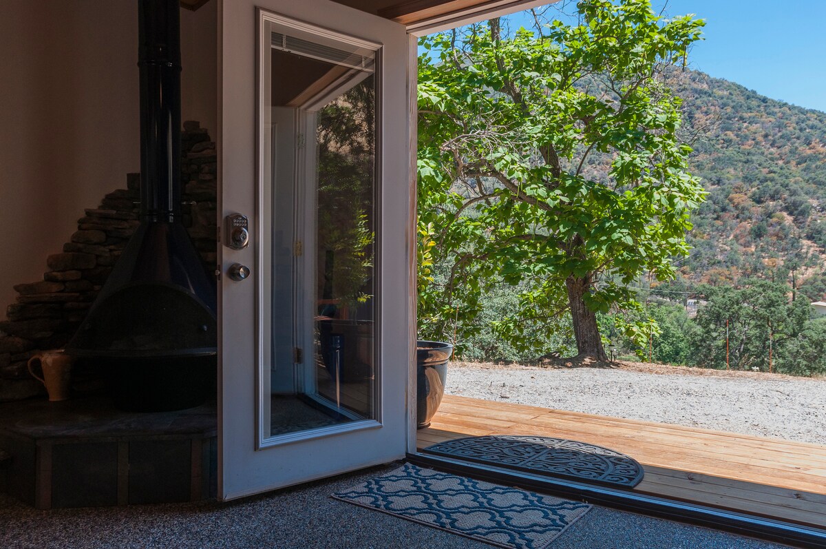 ARTSY MID-CENTURY Casita, minutes from Sequoia & Kings Canyon Nat’l Parks. Enjoy my spacious studio getaway on a private hill surrounded by gorgeous mountains & the sounds of the Kaweah River. Secluded, yet minutes away from restaurants, bars, galleries & markets. Full kitchen, half fridge. Basics, Hot Chocolate, coffee/tea spices, BBQ Grill, wood burning fireplace, WIFI, comfy Queen bed. Huge Rock shower! Explore the Parks, come home & relax, chill out in the SPA and stargaze... BLISS!