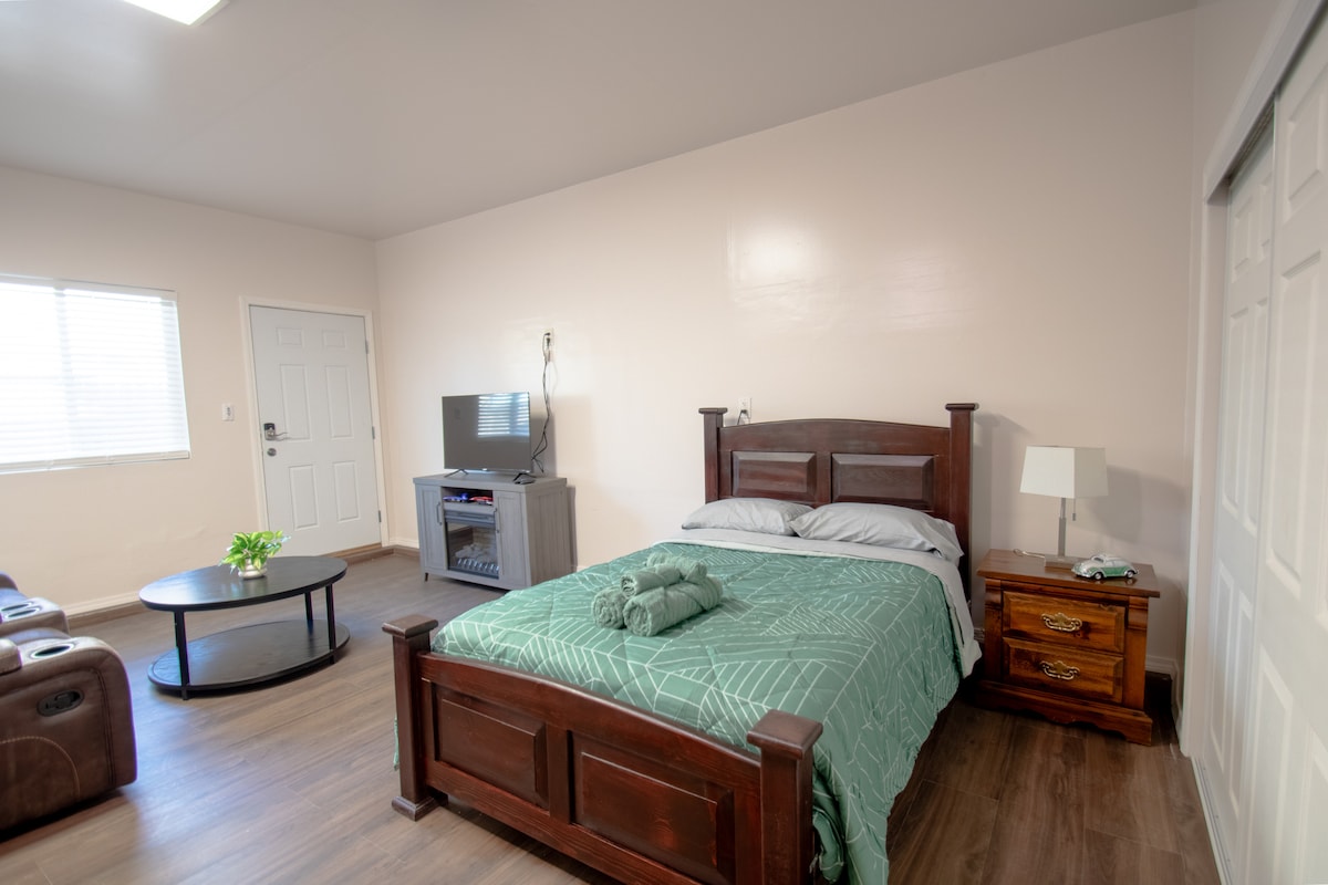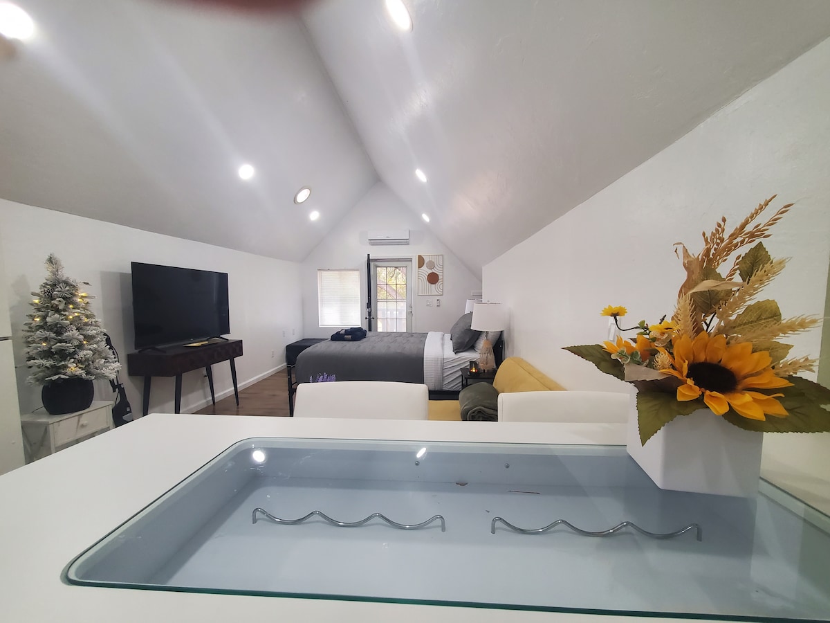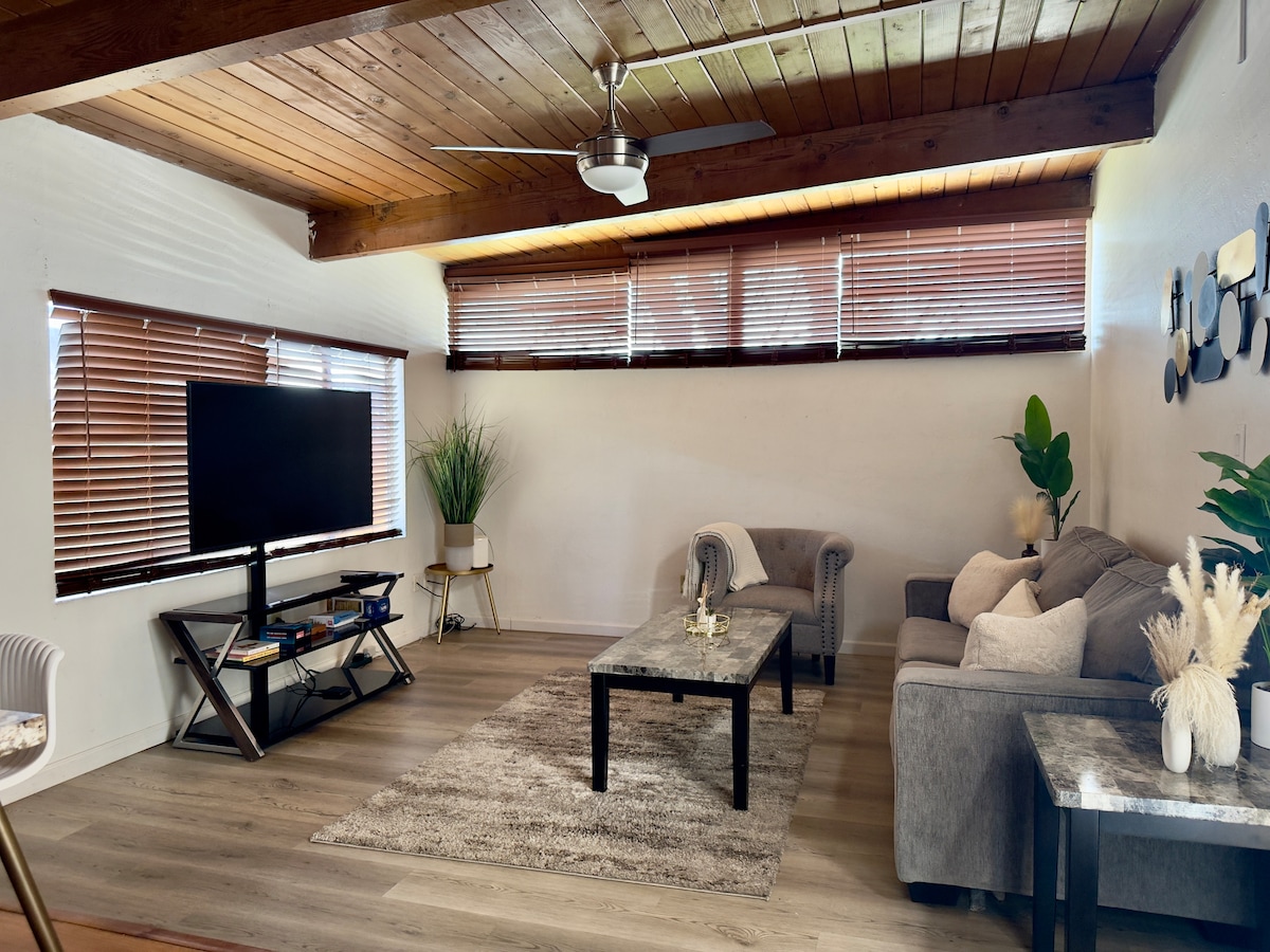 Beautiful Casita is a charming 1000 sq ft private living quarters featuring large great room, kitchenette, 1-bedroom, & bathroom. Located in quiet, private neighborhood behind secured gate on 2.5 acre property. Pool & spa are PRIVATE. Features large covered patio with Smart TV, bbq, & bar area. 2 SMART TV's inside. Guests have exclusive use of pool & spa! Casita windows look to pool & garden creating a retreat-like feel. 20 minutes from FARM Show and 60-minute drive to Sequoia National Park.