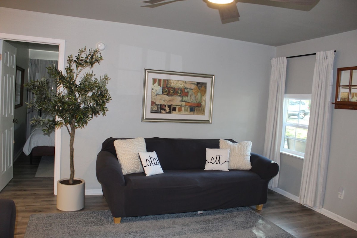 We welcome you to The Apartment Away from busy city streets with private entry, just outside of Owasso. Your private entrance opens to a living room with smart TV, fully stocked kitchen with island, and laundry room. The spacious bedroom has a queen size memory foam mattress, and en suite bathroom with walk-in shower. Heated and cooled attached sunroom is great for watching wildlife. We are on 2 wooded acres just a couple miles from shops and stores, in a safe and quiet country neighborhood.