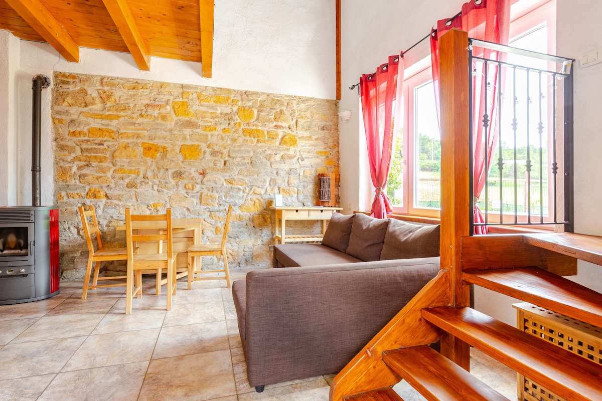 Delizioso monolocale di nuovissima realizzazione all’interno di un casale. L’appartamento è composto da una luminosa zona giorno con cucina a vista e tavolo da pranzo, divano letto (per due persone) e televisione, un ampio bagno con doccia a pioggia, servizi igienici e lavatrice. Il soffitto con travi a vista in legno sono il punto forte della casa e la rendono particolarmente affascinante.