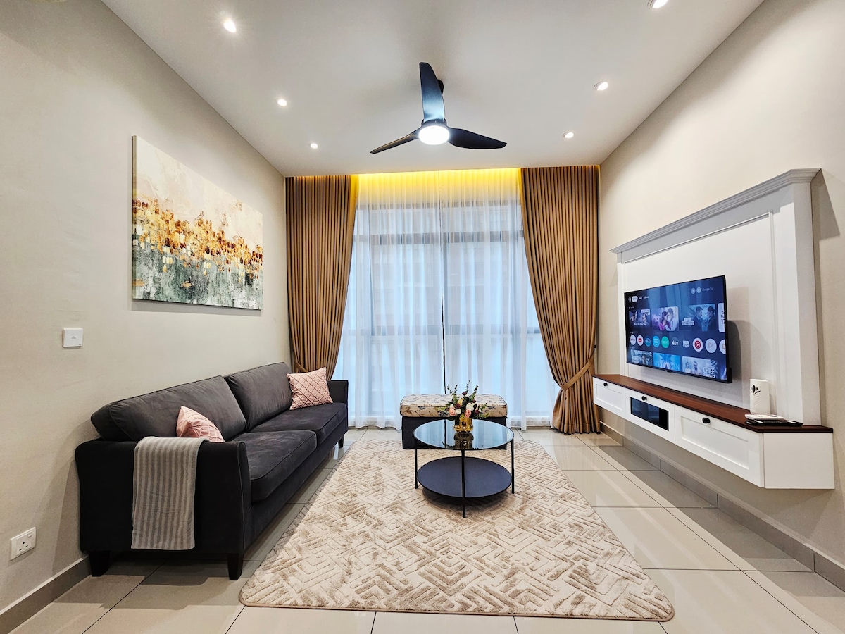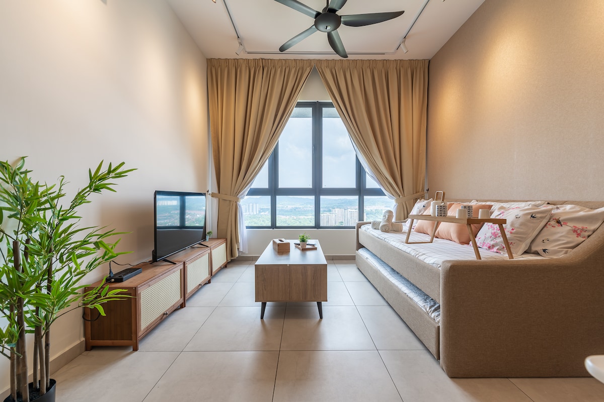 A cosy duplex on the highest floor of the building (Level 21), with a queen bed and a 3-seater sofa. Suitable for both short- and long-term stays. The building is in De Centrum Mall, with shops such as Super7 (supermarket), Mr. DIY, Watsons, and 7-Eleven among others, and facilities like launderettes and a clinic (Poliklinik MyMedik). •Check in time: from 3PM •Check out time: 12PM
