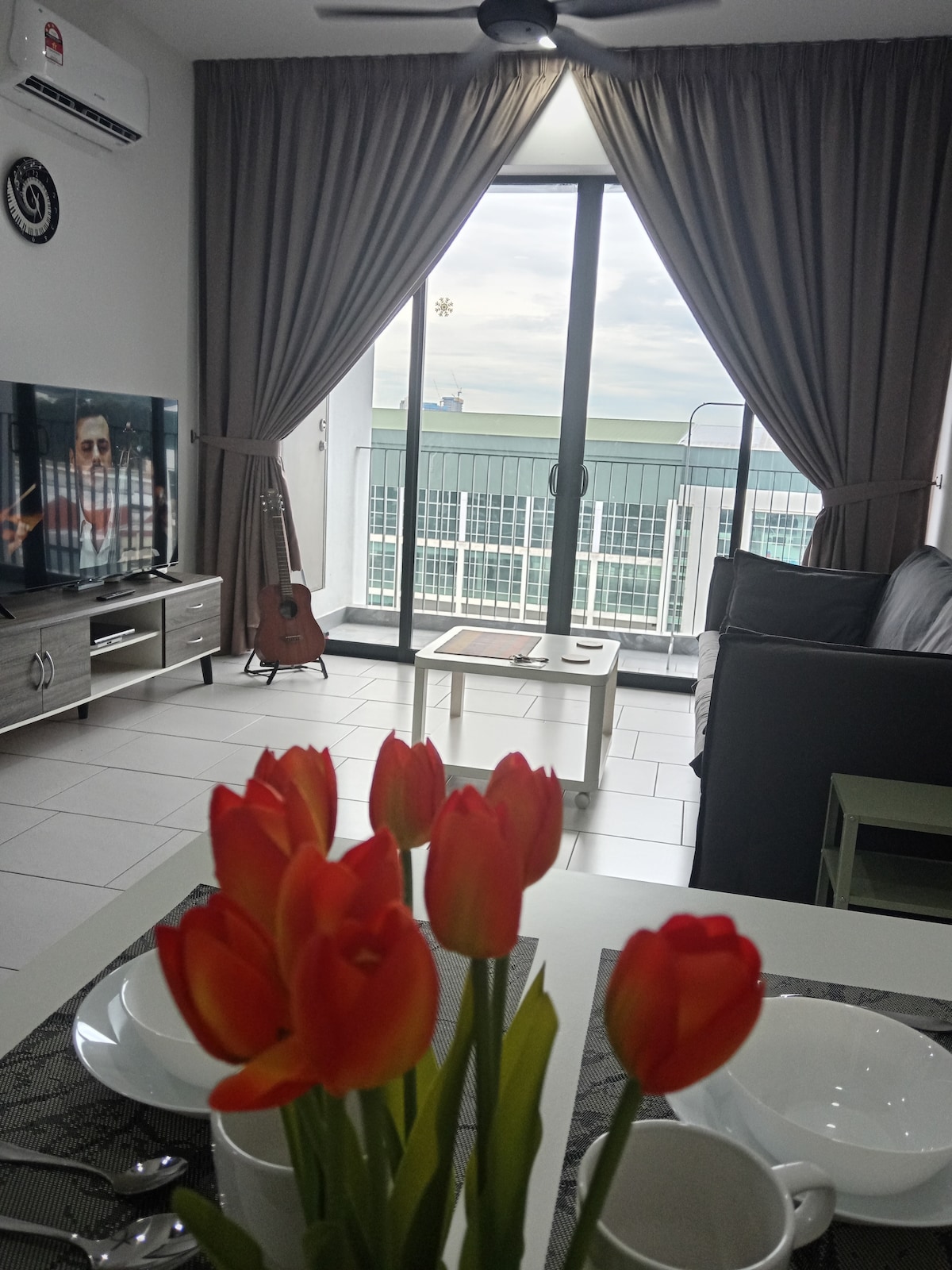 A cosy duplex on the highest floor of the building (Level 21), with a queen bed and a 3-seatersofa. Suitable for both short- and long-term stays. The building is in De Centrum Mall, with shops such as Super7 (supermarket), Tealive, Mr. DIY, SPP Bookstore and 7-Eleven among others, and facilities like launderettes and a clinic (Poliklinik MyMedik). •Check in time: from 3PM •Check out time: 12PM