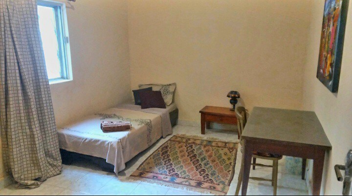 At walking distance from beach,supermarkets,bars, restos at Senegambia strip Kololi 4 bedrooms with double bed,bathroom with toilet, shower,safe,fan,AC. Parlor with tv,fan and couch. diningroom with chairs,table,fan. Kitchen has refrigerator,watercooker,gazrange,fan. Green flowerfull garden,pool,bbc,outside shower,sunbeds,parasol,shelter, table, chairs. Wifi, garden/pool maintenance,water incl. Price in function of occupation ! Solar AND generator BACKUP ! Electricity to be paid by guests.